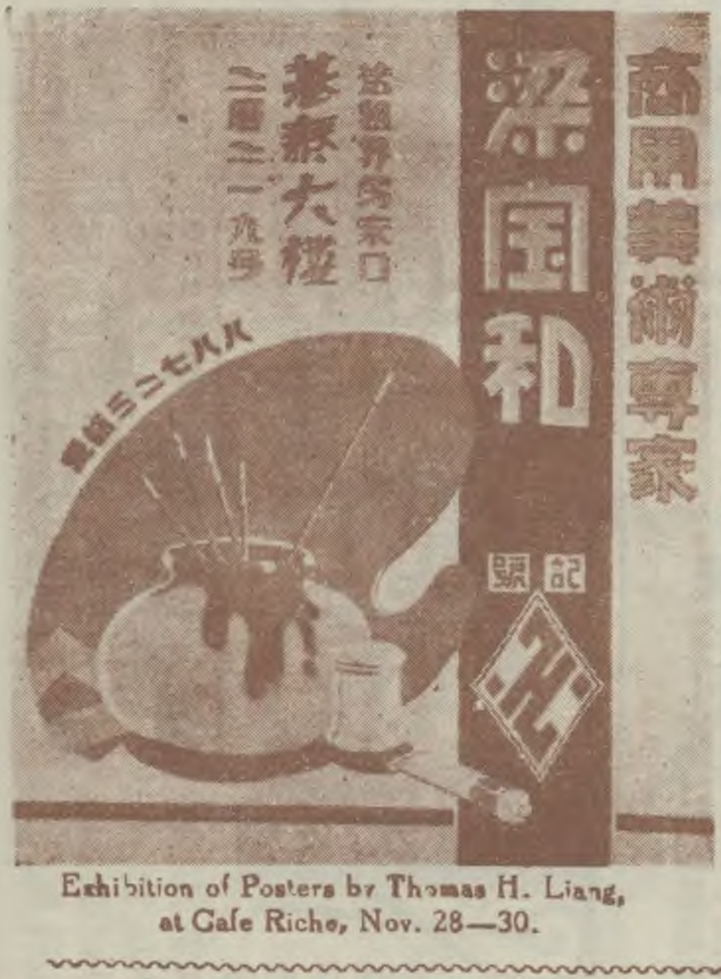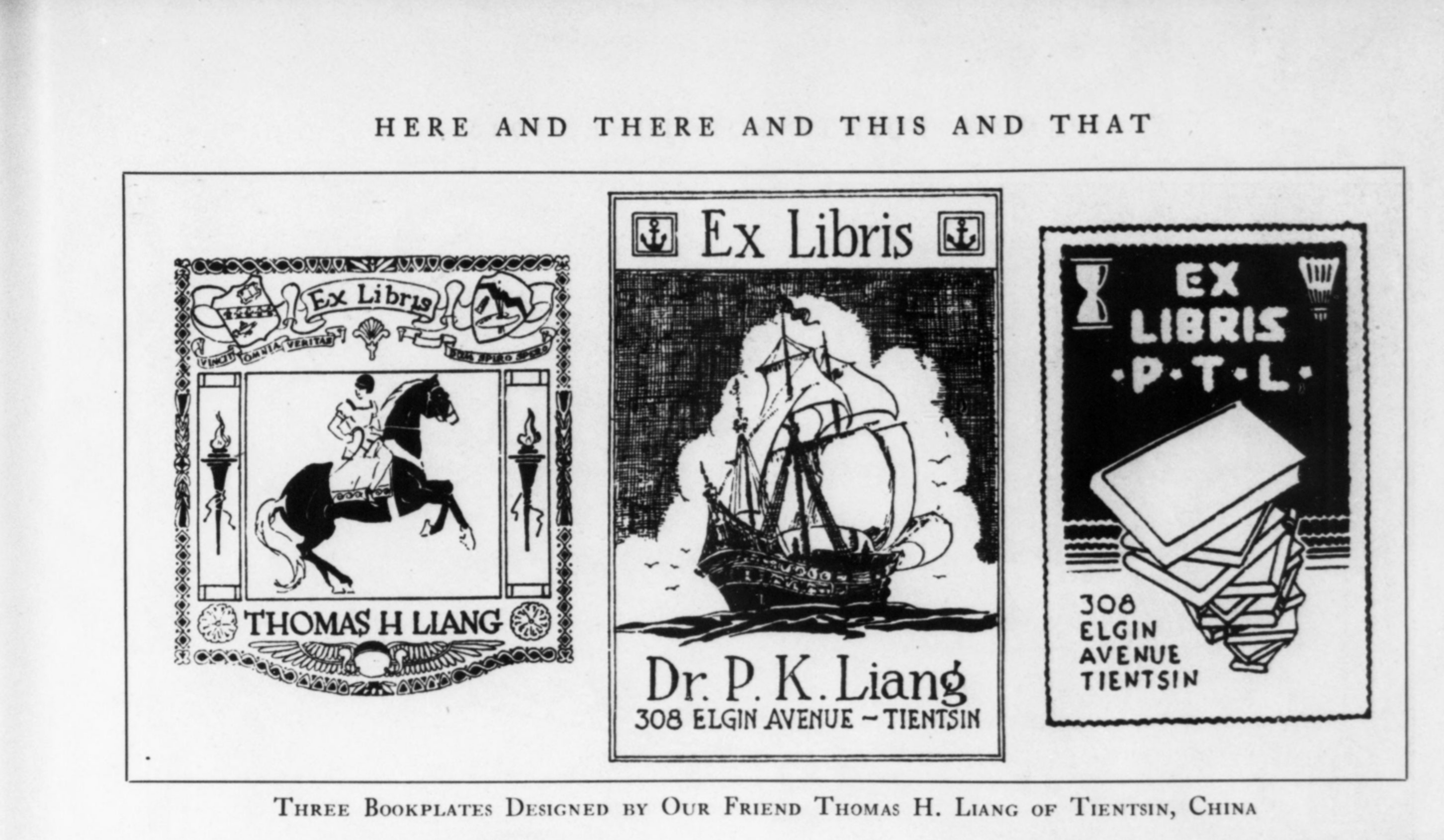 在我查找到的在美国宾夕法尼亚州东斯特劳兹堡出版的英文杂志《铅笔尖》Pencil Points1930年6月号里,也出现了“308, Elgin Avenue, Tientsin”的地址。这期杂志的第485页刊有三张设计风格各异的藏书票,这枚藏书票的创作者也就此浮出了水面。三张藏书票下的图注写道:“由我们中国天津的朋友Thomas H. Liang设计的三张藏书票。”(“Three Bookplates Designed by Our Friend Thomas H. Liang of Tientsin, China.”)