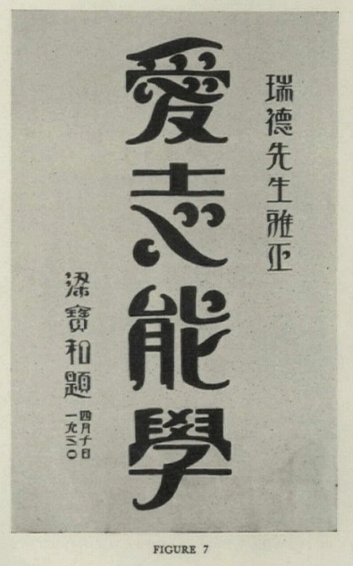 在8月号的《铅笔尖》,刊出了一篇署名为Thomas Pao Ho Liang的文章,标题是《汉字的变革》(“The Revolution of the Chinese Characters”),这是一篇介绍中文美术字设计的文章,配有几幅相关插图,包括一些字体案例和《铅笔尖》的中文版设计,第687页的第七号插图赫然是Thomas Pao Ho Liang赠给编者的美术设计,上面写着“瑞德先生雅正 爱志能学 梁宝和题一九三〇四月十日”。Thomas Pao Ho Liang的中文名梁宝和出现了!梁宝和就是梁如浩最小的儿子,生于1905年,前文所提宝鉴、宝畅、宝平等,都是他的兄长。
