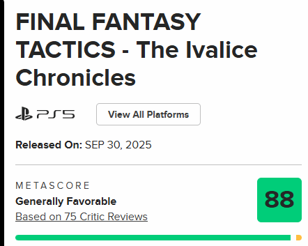 在Metacritic上,《最终幻想战略版 伊瓦利斯战记》获得了88分的媒体综合评分,跻身2025年高分游戏行列。而玩家评价更高:Steam好评率达90%(22860条评价),PlayStation Store与Xbox商店的用户评分几乎满分。