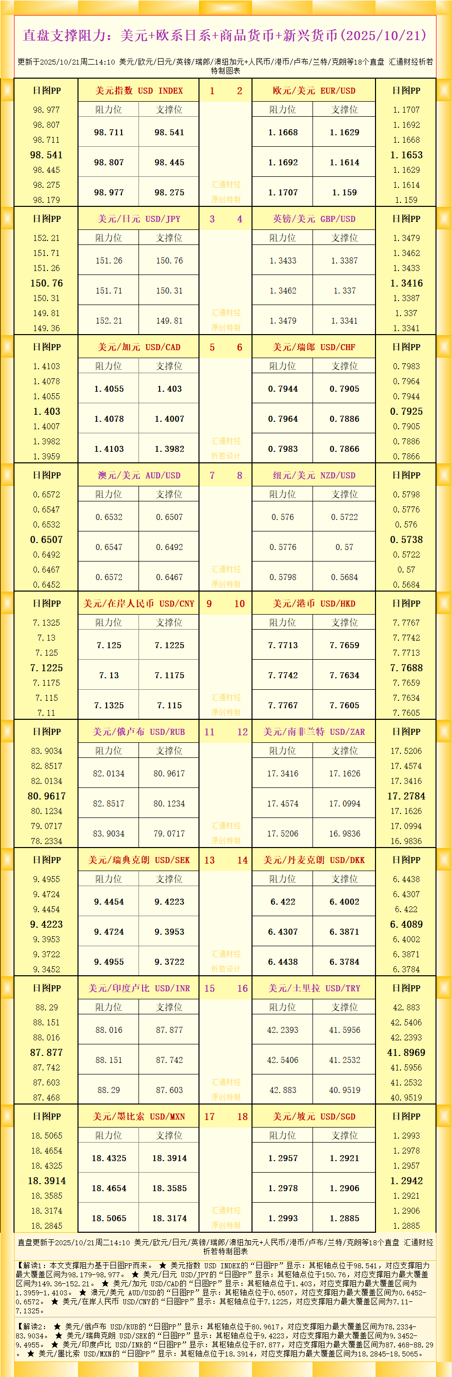 一张图看直盘支撑阻力:美元+欧系日系+商品货币+新兴货币,更新于2025年10月21日周二14:10,具体美元/欧元/日元/英镑/瑞郎/澳纽加元+人民币/港币/卢布/兰特/克朗等18个直盘,更多详见汇通财经析若特制图表中的内容。