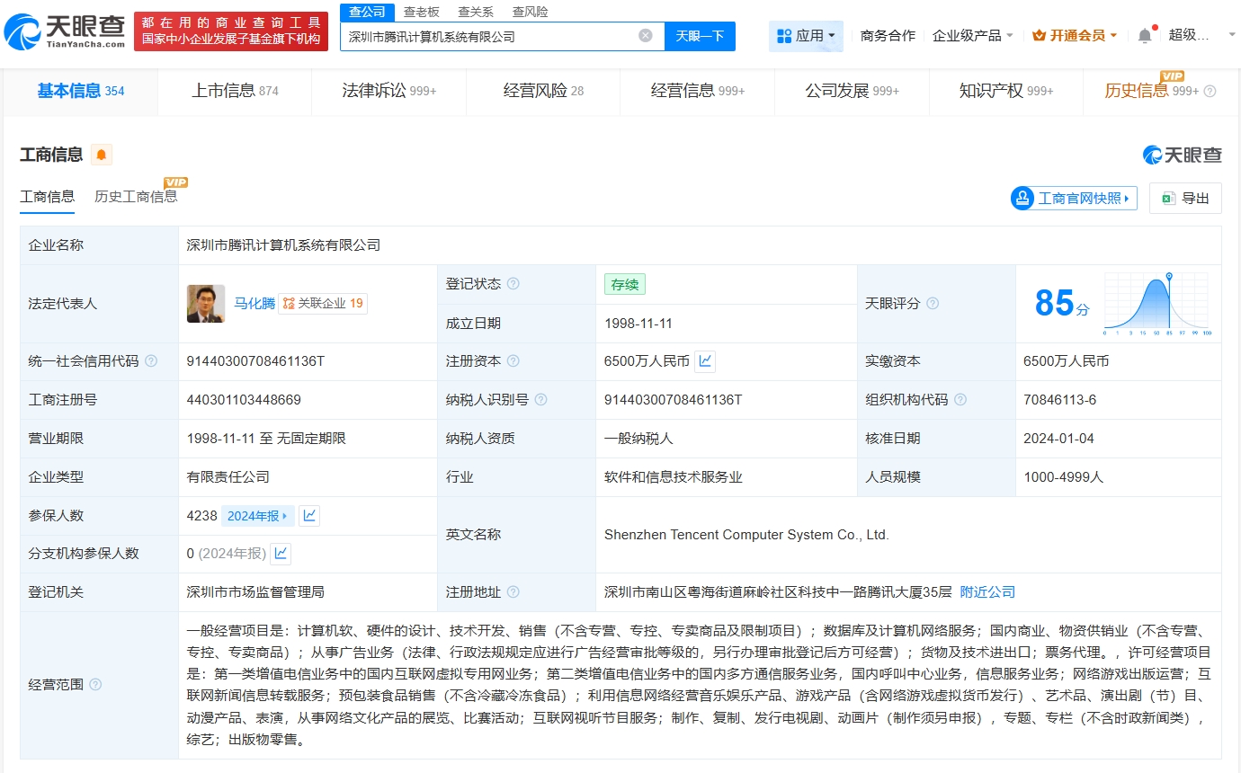 深圳市腾讯计算机系统有限公司成立于1998年11月,法定代表人为马化腾,注册资本6500万人民币,经营范围包括利用信息网络经营音乐娱乐产品、游戏产品、艺术品、演出剧(节)目、动漫产品、表演等,由马化腾、张志东、陈一丹、许晨晔共同持股。