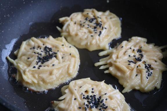 煎饼的时候,平底锅是关键。锅里刷一层薄薄的植物油,烧热后舀一勺面糊进去。别急着翻面,用铲子轻轻整理成圆形,撒点黑芝麻提香。开小火慢慢煎,煎到一面金黄再翻面,两面都煎得黄澄澄的,大概2分钟就够了。火候别太大,不然外焦里生,口感就差了。煎好的饼,边边脆脆,中间软软,香味能把隔壁邻居都勾过来!