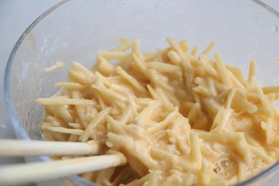 做法也简单,厨房小白都能上手!先把苹果洗干净,用擦丝器擦成粗丝。为什么要粗丝?因为这样吃起来有嚼劲,口感更丰富。擦好的苹果丝放碗里,磕入俩鸡蛋,撒一勺面粉和半勺盐。拿筷子使劲搅拌,搅到苹果丝和鸡蛋糊完全混在一起,黏黏稠稠的就差不多了。这一步别偷懒,搅匀了煎出来才好吃。