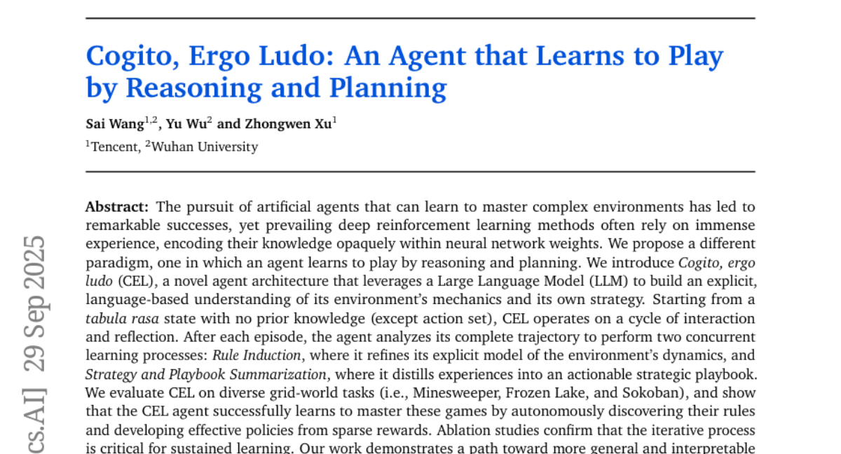 想象一下这样的场景:当你第一次接触一款全新的游戏时,你不会立即知道所有规则,而是通过试玩、观察和思考逐渐理解游戏机制,然后制定策略来获胜。现在,研究人员成功创造了一个能够像人类一样学习和思考的AI智能体,它不是通过死记硬背大量游戏数据来获胜,而是真正理解游戏规则并制定策略。