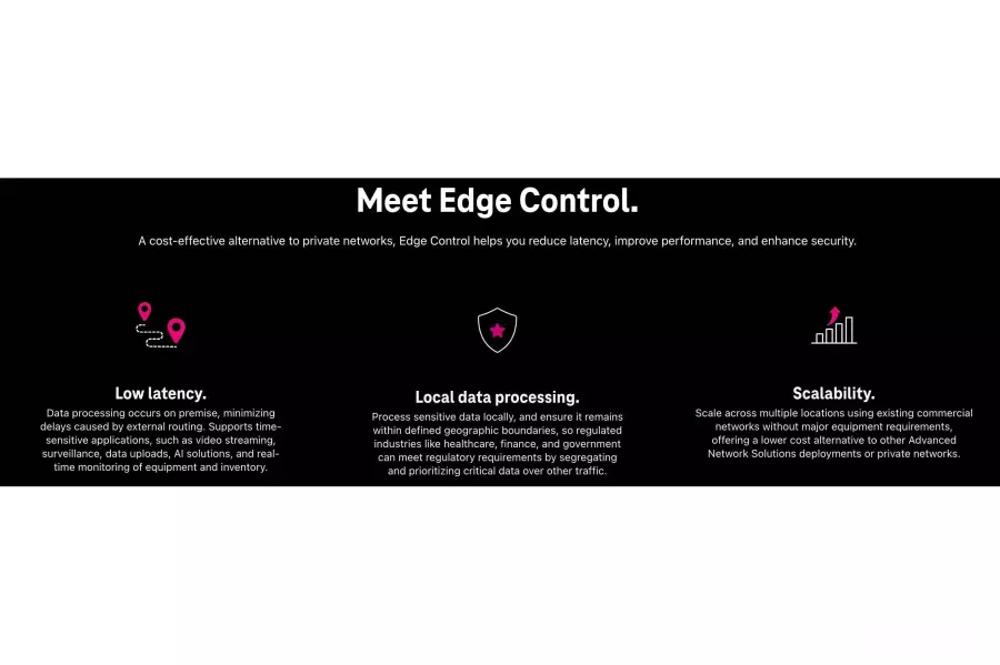 Edge Control是面向时延敏感和高安全性场景的网络解决方案,这类工作负载对毫秒级的延迟都十分在意。它基于T‑Mobile的5G Advanced网络,利用本地分流和边缘计算的原理,在数据产生地点附近进行处理,而不是让其像普通互联网流量那样跨越全国传输。
