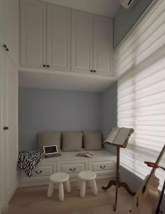 阳台:从客厅往里走,还有一个小阳台,阳台被打造成了一个音乐室和储物空间,这样的设计让整个房子的功能性变得更加完善,平时在这里坐着弹弹吉他,听听音乐,晒晒太阳也是一件特别享受的事情,阳光随着窗户洒下,可以用百叶帘自由调节光源,这样的布置会更加温馨和舒适。