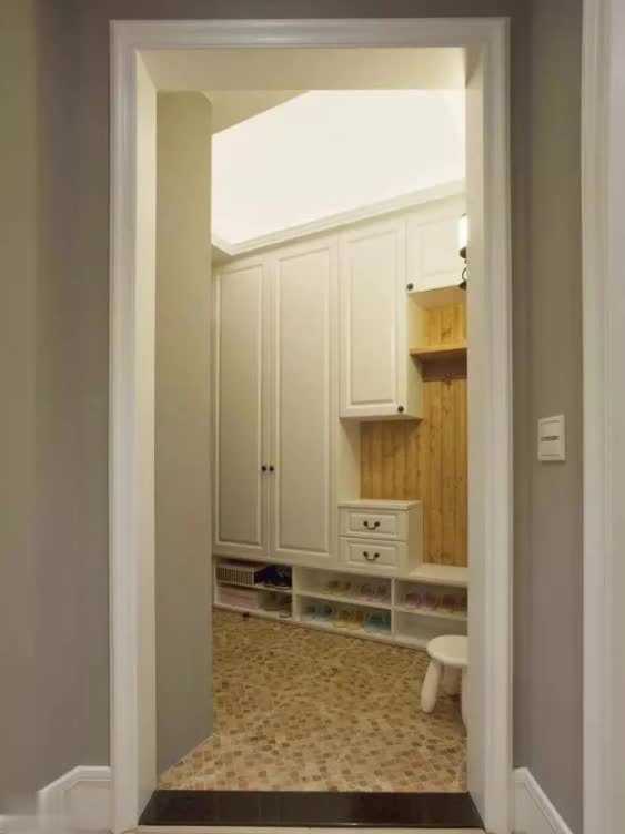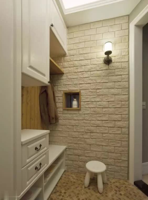 玄关:不管从哪个角度看玄关,我们都能发现,闺蜜已经把整个家的空间给利用到了极致,靠墙打造了换鞋凳、挂钩区、收纳柜的设计,让本就有点狭小的空间变得更加拥挤,虽然这样的布置会更加实用,但是我个人觉得有些窒息了,墙面的上的壁灯和墙面的文化砖,让整个空间都变得大气起来,地面上的小花砖却过于密集,让人看着没有那么喜欢。
