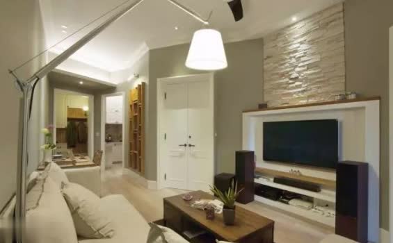 墙面上都刷了灰色的乳胶漆,看上去静谧而美好,浅灰色的沙发和米白色的窗帘相互映衬,平时窝在沙发上,会让人觉得格外美好,电视背景墙和玄关的设计保持一致,看上去更加和谐统一,电视周边做了一些造型,看上去也有点多余,如果房子面积小,还是干干净净的会更好看。