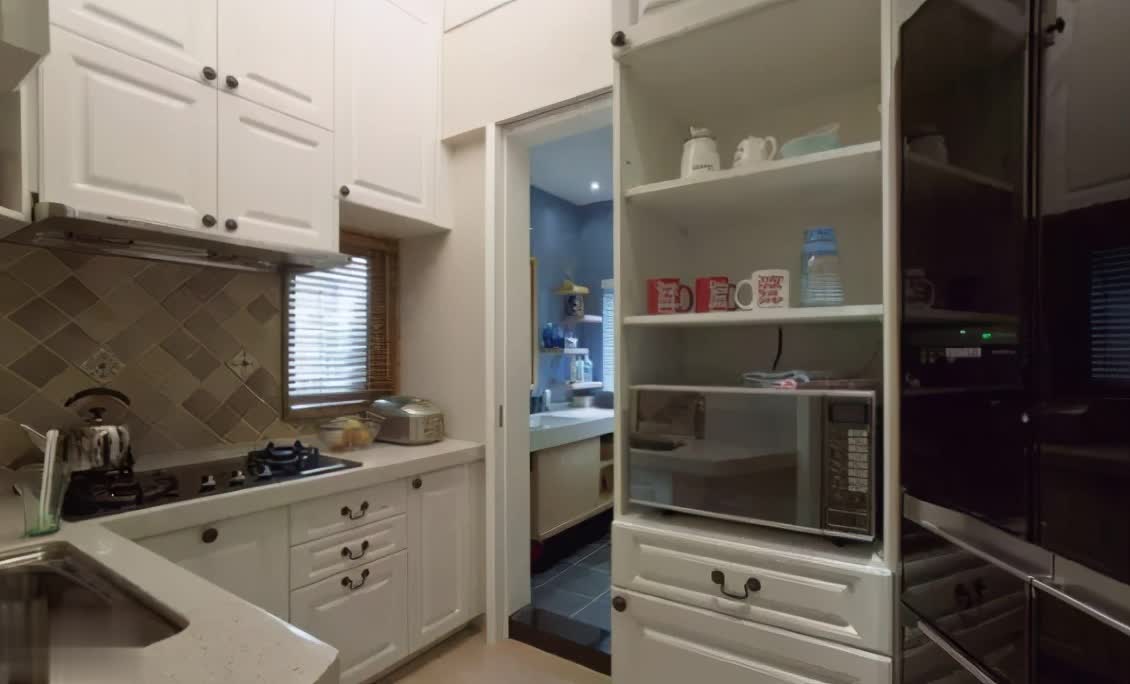 厨房:厨房的空间还算不错,因为是不规则的设计,所以在设计的时候用了一些技巧,左拐右拐+角落的空间都没有被浪费掉,洗菜、切菜、烹饪的流动线很好,所以看上去美观又实用,这样的厨房还是比较可取的,而且色彩搭配的也不错,看上去比较清新舒适。