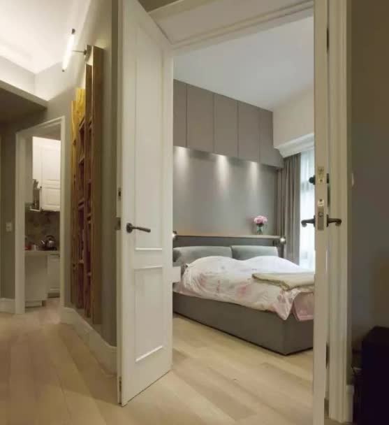 主卧:主卧的空间是以浅色调为主的,床头背景墙是灰色的,搭配着剩下的白色墙面和浅色带花纹的长跑,看上去静谧而美好,在整个的空间,还做了不少收纳的设计,哪怕房子面积再小,以后也都不会变得凌乱,床尾的地方还有衣柜,储物空间是非常的强大,整个主卧的采光也比较好,看上去通透又明亮。