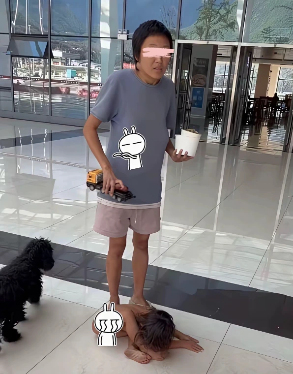 有人给孩子送饭吃,却被坚持要求放在地上,让孩子俯身舔食。