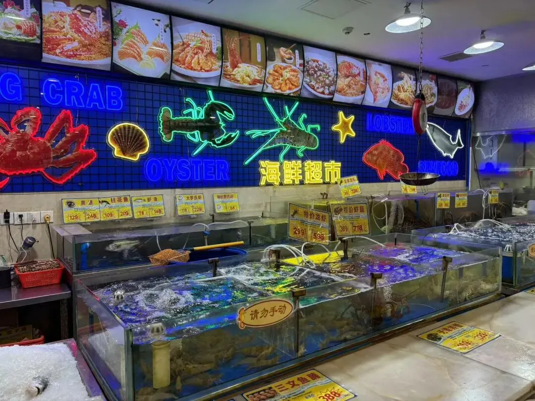 当年渔民新村的门口,摆着几十个巨大玻璃缸,里面的龙虾、皇帝蟹、花龙趸活蹦乱跳。