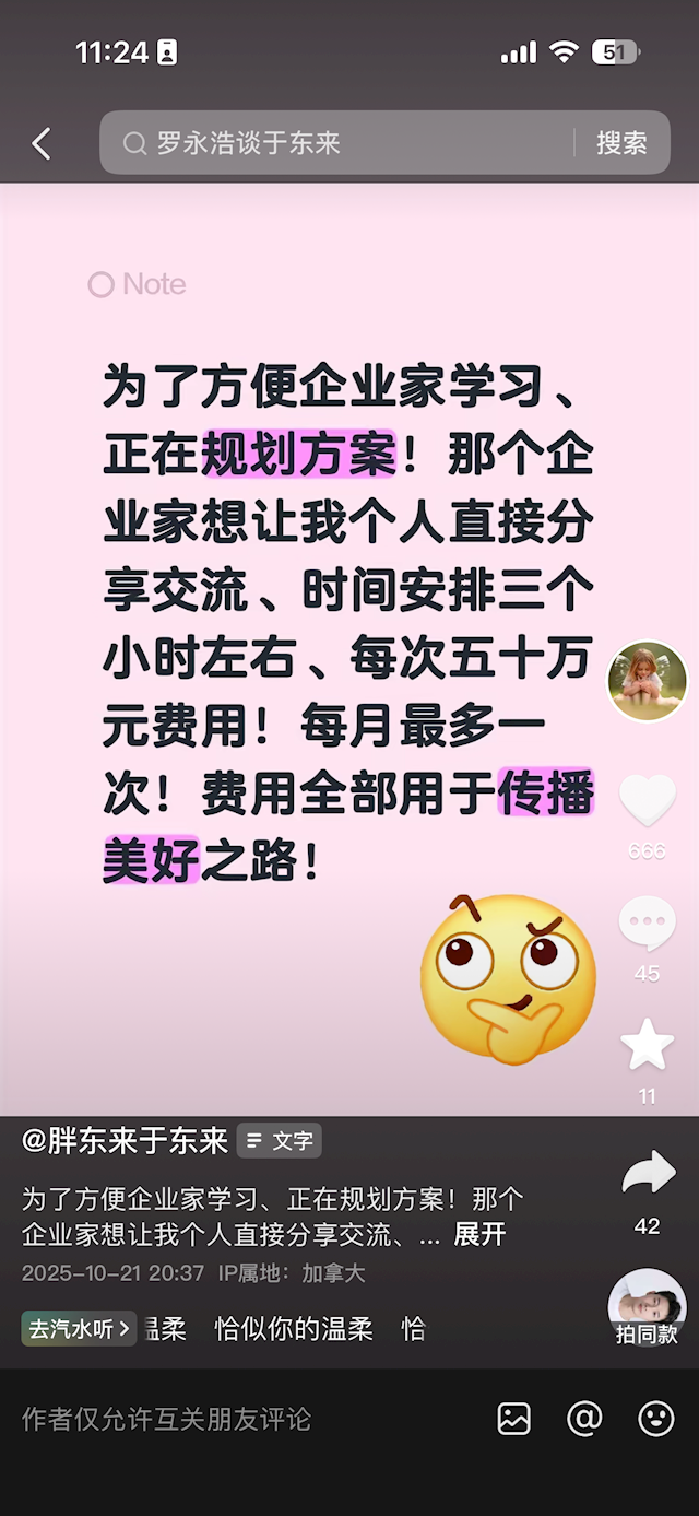 不过,紧接着,于东来又表态称:还有免费的!会在网上与大家直播分享交流!