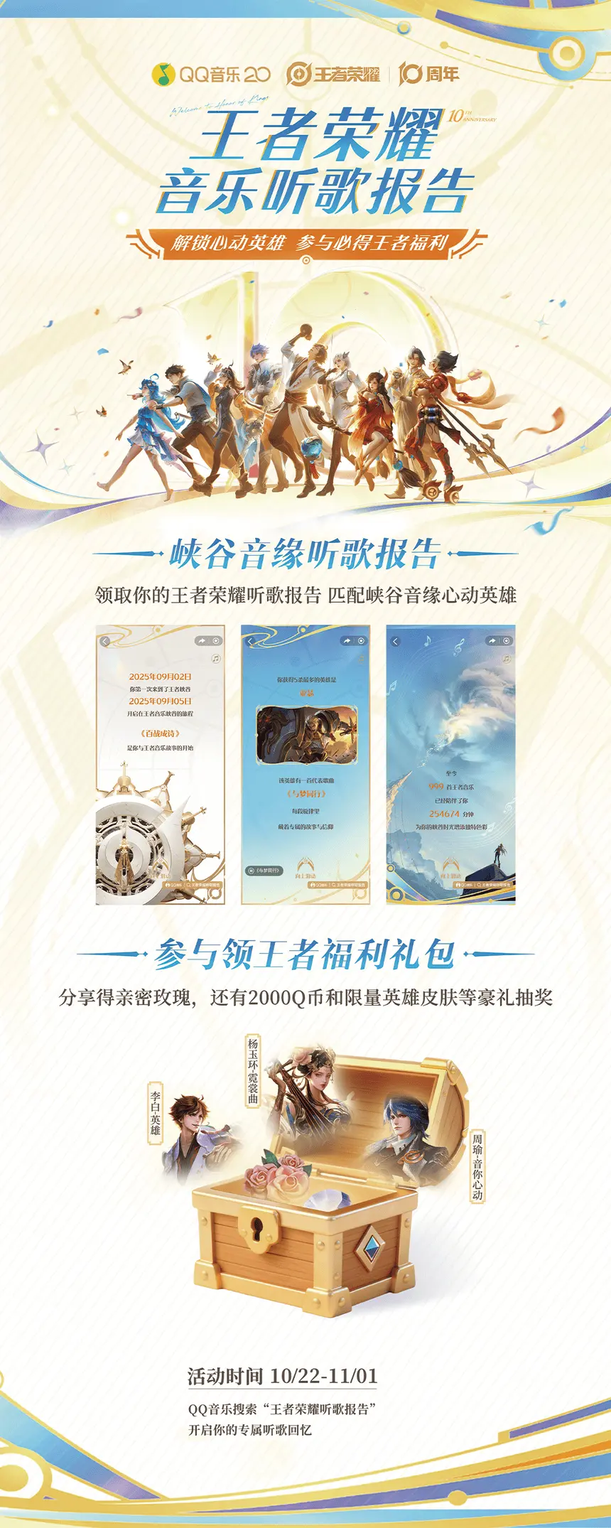 10月22日,在QQ音乐二十周年和王者荣耀十周年之际,QQ音乐上线“王者荣耀音乐听歌报告”特别企划活动,此次活动基于游戏和音乐数据回溯用户过往十年和王者荣耀的音乐连接,参与活动即可开启一段峡谷音缘与福利狂欢。