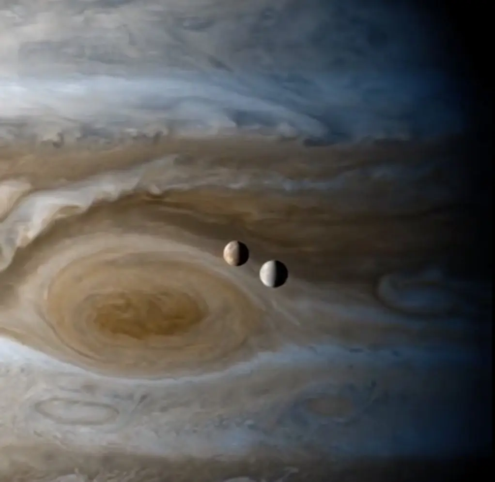 画面记录了木星的两颗卫星——艾奥(Io)和欧罗巴(Europa)从木星前方经过的瞬间。