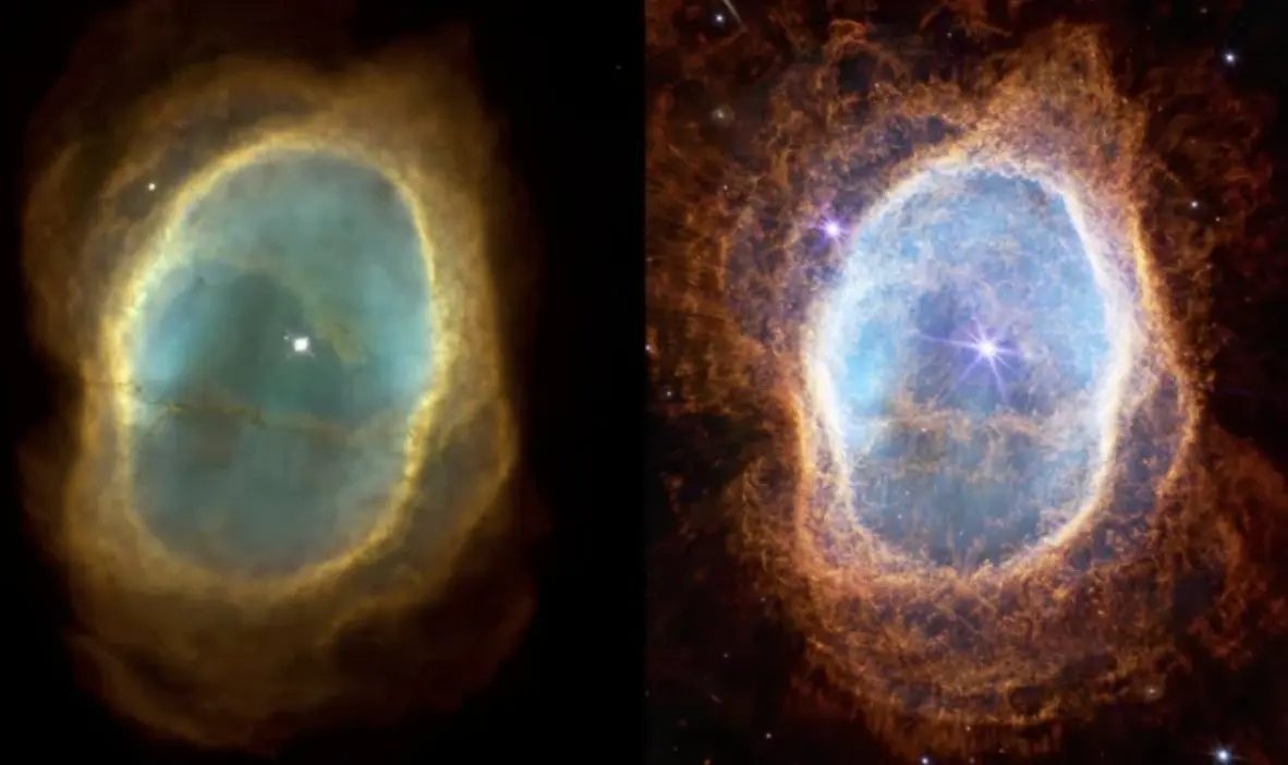 这张照片对比了哈勃空间望远镜(Hubble Space Telescope,用于观测宇宙的太空望远镜)与詹姆斯·韦伯空间望远镜拍摄的“环状星云”。