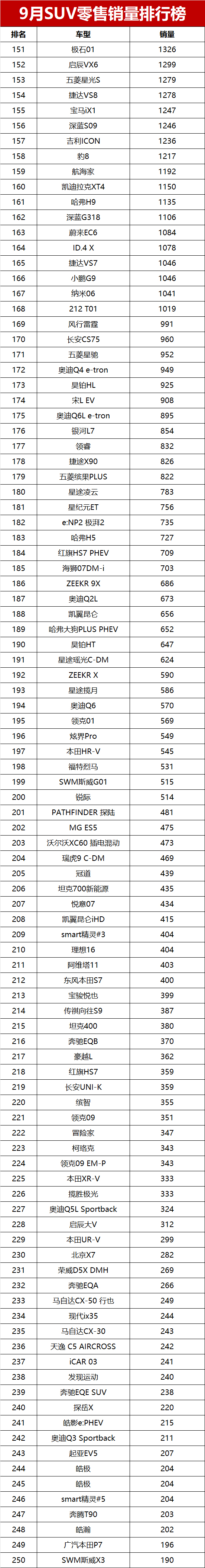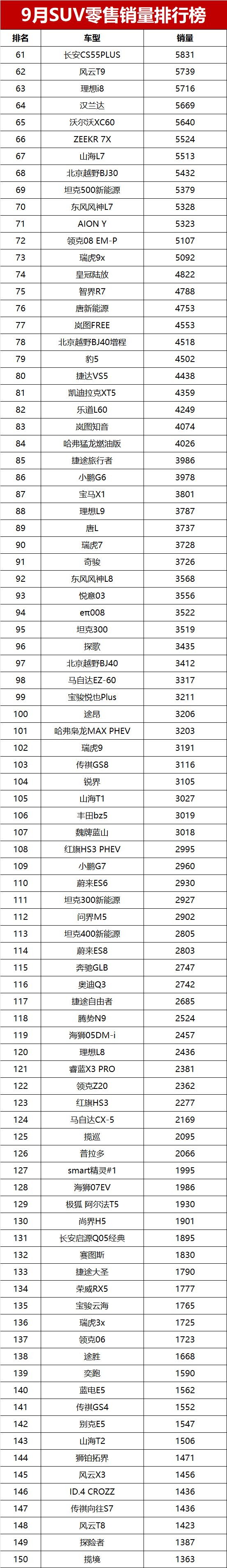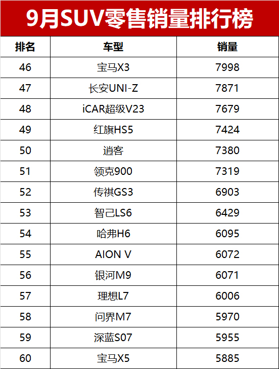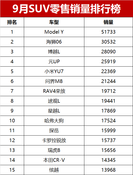具体来看,9月份Model Y以绝对优势断层式领先,以51733辆的销量夺得SUV销量冠军,展现出强大的市场号召力,这也是这款车型进入2025年后零售销量首次突破5万辆。海狮06紧随其后,以30532辆的销量排名第二位,成为自主新能源SUV的代表车型。作为燃油SUV销冠的博越L以28090辆的销量排名第三位,是前三甲中唯一的燃油车型。元UP和小米YU7分别以25919辆和22369辆的销量位列第四和第五位,前五席中新能源车型占据四席。