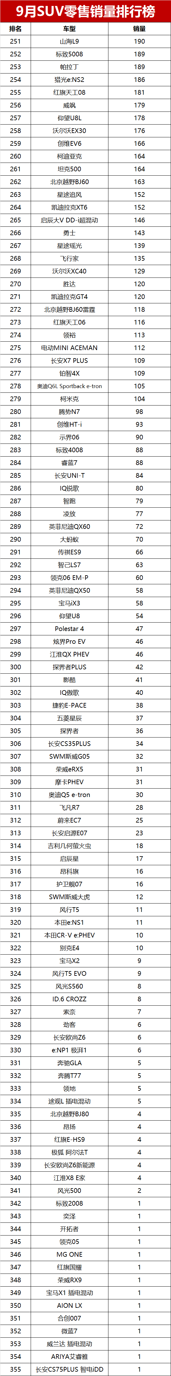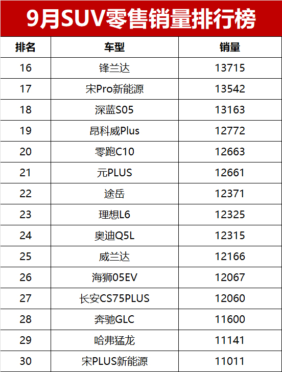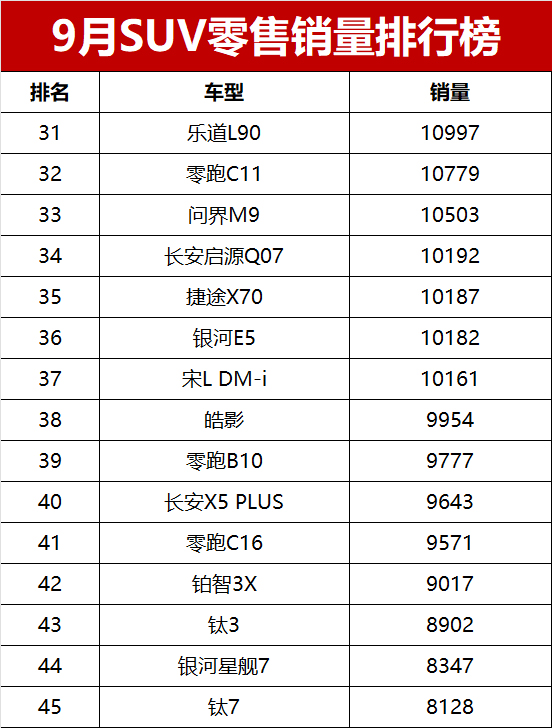 【2025年9月SUV零售销量排行榜 完整版】近日,乘联会公布了最新月度乘用车销量数据。数据显示,2025年9月份国内SUV市场延续"金九"旺势,零售销量表现强劲,达到113.1万辆,同比增长9.0%,环比8月份增长10.2%。9月份销量破万辆的SUV达到37款车型,其中销量超过2万辆的车型有6款。新能源车型持续领跑市场,包揽榜单前两位且前六席中占据五席;燃油车虽未抢占榜首,但凭借深厚市场基础保持稳定输出,共有18款燃油SUV销量破万辆,博越L夺得燃油SUV销冠,同时也是销量最高的自主燃油SUV车型。