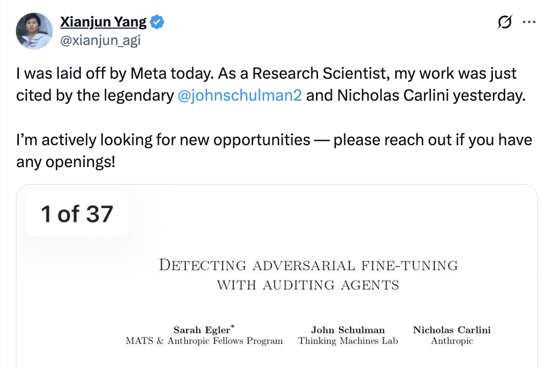 研究员Xianjun Yang发文称:“我今天被Meta解雇了。作为一名研究科学家,我的论文昨天刚刚被传奇人物@johnschulman2和Nicholas Carlini引用了。我正在积极寻找新的机会——如果您有任何空缺,请联系我!”