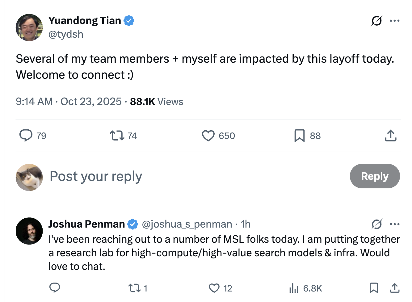 值得注意的是,裁员波及了华人AI大佬、FAIR研究科学家总监田渊栋,他在社交平台X上公开表示自己和团队成员均受到影响。