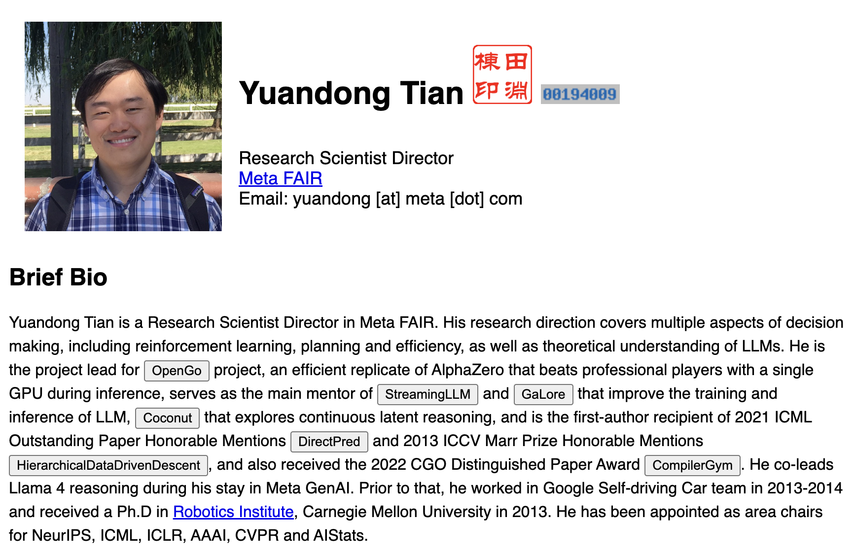田渊栋是AI领域的重要华人研究者、科幻作家。他于2013年从美国卡内基隆大学机器人研究所博士毕业,2016年加入Meta GenAI担任研究科学家,研究方向涵盖强化学习、规划与效率以及对大型语言模型的理论理解,曾参与领导了OpenGo项目研发、Llama 4推理等工作,获得过2021年ICML杰出论文荣誉提名、2022年CGO杰出论文奖等重要奖项。此外,他还撰写了硬核长篇科幻小说《破晓之钟》。