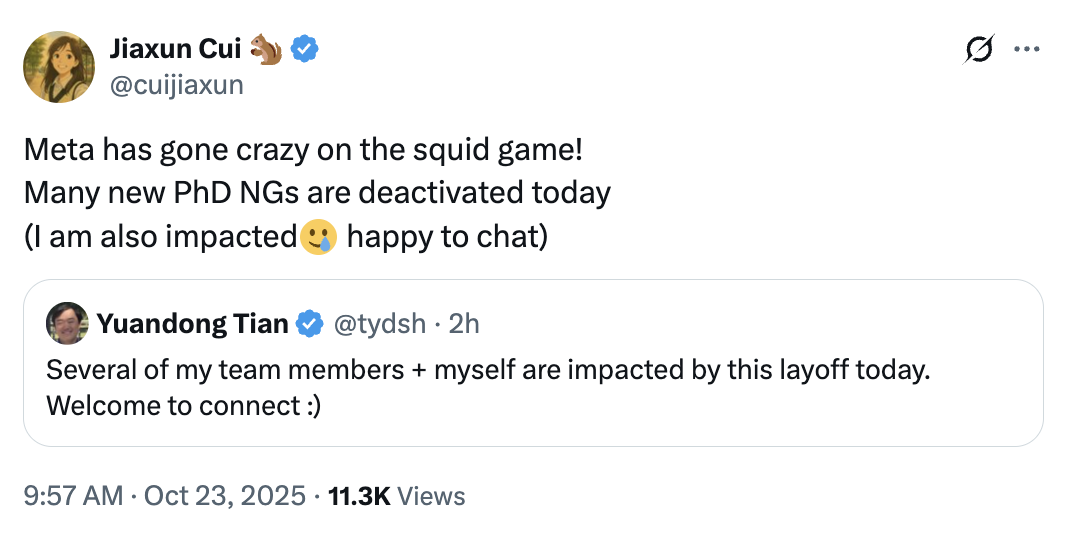 除了田渊栋,成批的华人AI研究员都受到了影响。本科毕业于上海交通大学的华人研究员Jiaxun Cui在社交平台X上称 :“Meta为鱿鱼游戏疯狂了!今天很多新博士生NG都被停用了(我也受到了影响,?很高兴聊天)”