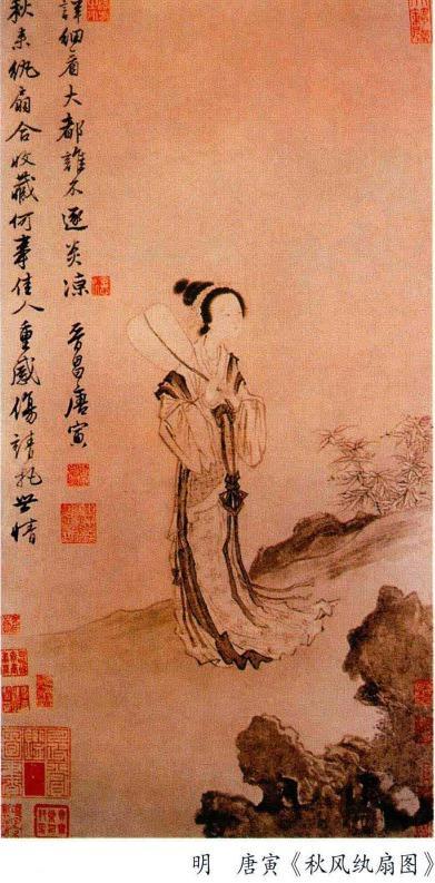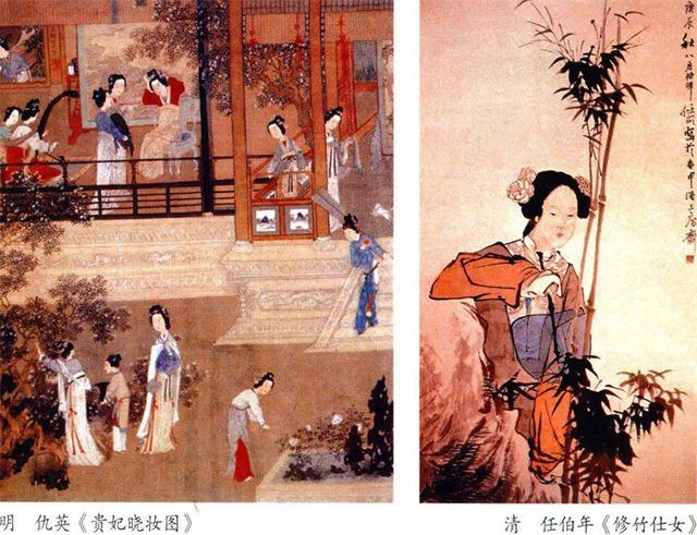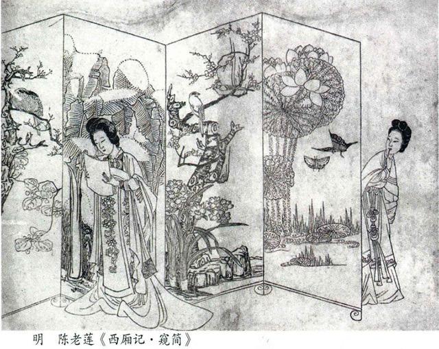 明代的仕女画大致分为两种风格。一是以仇英为代表的在继承唐宋传统画法的基础上刻画更加细腻,设色更加浓丽。仇英注重临摹,熟练地掌握了一套大青绿重彩的设色技法,有很强的造型能力,并精于界画,他一生创作了大量仕女画,形成了严整工细的仇派风格,这一点是其他画家所不及的。但是也正是因为以上原因,他忽略了从现实生活中汲取营养,所以他的画总的来看,缺乏生活气息和时代感。现存故宫的《人物故事册》是他的代表作,其中《贵妃晓妆图》表现宫中贵妃和宫女们晨起梳妆、掐花、调琴等活动,再配以楼台、花草林石,真是一派撩人的春色。在这同时以水墨写意为主的画风也正在崛起。如唐寅的《秋风纨扇图》,张路的《吹箫女仙图》、《凤凰仙女图》,都以简洁概括、顿挫有力的线条,淡墨或淡彩渲染,更增添了画面的韵味。明末陈老莲的仕女画,不拘泥古法,人物造型独特。采用夸张变形的手法,把人物动态神情刻画得淋漓尽致,优美动人。仕女画的代表作有《西厢记》插图、《女仙图》等。尤其《西厢记》插图中《窥简》一幅,把深深爱着张生的崔莺莺在屏风前偷偷拆开红娘传来的书信,而热心的红娘躲在屏风后偷偷地观察的情景,描绘得十分动人。而屏风上花卉的处理则花开并蒂、鸟成对、蝶成双,烘托了这一爱情故事的主题,表现了陈老莲精湛的技巧和超群的才华。《窥简》虽是一幅插图小画,但决不愧为一幅仕女画的名作。陈老莲画坛独树一帜,在画史上享有重要位置。后人称陈老莲的画“三百年来所无,风格在仇(英)、唐(寅)之上”。陈老莲的画风追随者甚多,对后来的二任(任熊、任熏、任颐)乃至现在的人物画都有很大的影响。