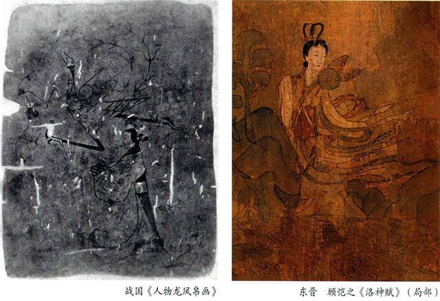 这个时期见于记载不少,据《西京杂记》所记载,汉代宫廷画工毛延寿是我国最早的一位专画妇女肖像的画家。毛延寿画王昭君的故事流传至今,他的作品有《宫女图册》,但只见于画史记载,并没有流传下来。湖南马王堆出土的彩绘帛画和战国楚墓帛画,应是我国所能见到的最早以女性为题材的画,然而它并不成熟,只具有仕女画的雏形。真正以女性为题材比较完美的卷轴画要属东晋顾恺之的《洛神图》、《女史箴图》和《列女仁智图》。其中《洛神图》(宋代摹本),作者采用圆润挺秀、细劲连绵的线条,宛如春蚕吐丝,行云流水,把洛神回首顾盼,凌波微渡的姿态,刻画得细致入微。这个时期的造型特点为秀骨清像、薄衣广袖、风带长裙,显示出飘飘欲仙的动势,配景极富于装饰性。人大于山是早期人物画的特点。顾恺之从理论上还提出“于妙处传神,正在阿堵中”“手挥五弦易,目送飞鸿难”的形与神的关系。并提出“迁想妙得”,源于生活,高于生活,以艺术夸张的手法创造典型人物的理论,对后世人物画的创作都具有一定的指导意义。