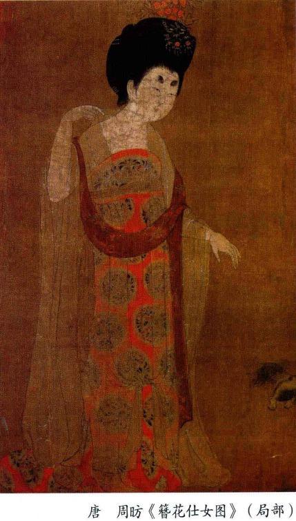 唐、五代是我国历史上政治、经济、文化的极盛时期。绘画,特别是人物画成为上层人物的主要宣传工具。强大的国力,与此相应的审美意识,使仕女画形象追求丰腴肥体,雍容华贵的特点。无论是宗教壁画和近年来发掘的唐代墓室壁画中的宫女群像,宫廷妇女和生活中的女性,以及唐俑等妇女形象,无不丰满圆润。唐著名画家张萱的《虢国夫人游春图》、《捣练图》和周昉的《挥扇仕女图》、《簪花仕女图》这种健康丰满的造型特点更为显著。唐代仕女画的另一特点是发梳高髻,发髻的高低代表一定的等级。贵族妇女的发髻相当高,有“发髻峨峨高一尺”的诗句。簪花仕女就是这种装束的典型。李白《宫中行乐词》中有“山花插宝髻”的诗句来赞美这种装束。另外唐代仕女画,宽袍大袖(初唐为窄袖,中晚唐为宽袖)并罩以轻纱,长裙拖地更增加了雍容华贵、潇洒飘逸的风采。