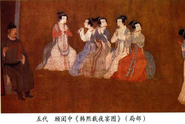 五代的仕女画。以顾闳中的《韩熙载夜宴图》为例,造型比唐仕女稍瘦,脸趋向椭圆形,用线变化较多。在唐代以“圆”和“柔劲”的基础上加进了转折顿挫的笔法。这种刚柔相济的线描方法更增加了线的表现力。在用色上比唐代更为丰富。大量的间色和大块的墨色(屏风、桌、床)相互映衬,调和统一,形成五代艳丽、凝重、多姿的仕女画风格。脸的画法开始用赭石分染(染凹面),技法更加规范化。总之,唐、五代的仕女画基本上奠定了中国传统人物画“以线造型、分染阴阳、平涂罩染、开脸勾线”的基本技法,并趋于成熟,成为后世学习人物画临摹的范本。