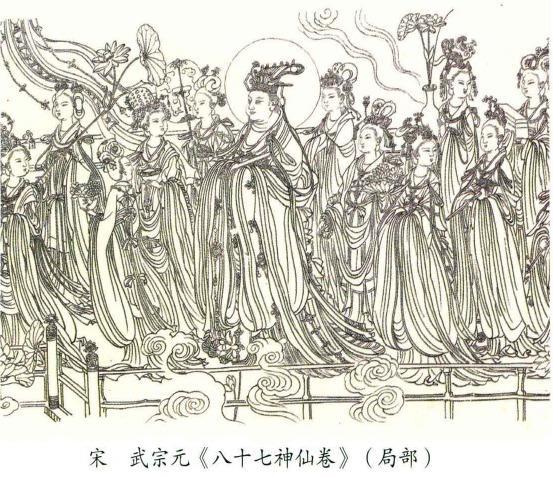 另外,《八十七神仙卷》(传为武宗元所作)以道教为题材,描绘众神仙一同朝拜元始天尊的仪仗行列,其中六十六名女仙描绘得极为生动。稠密而有序的线条极富韵律感。女仙们左顾右盼的神情、动态、珠光宝气的佩饰,加之幡旗、伞盖、花枝都非常和谐地统一在一个缓缓行进的群仙行列中,给人以“仙乐飘飘,赤城霞起”的美好联想。《八十七神仙卷》是我们今天学习仕女画,特别是白描人物最好的范本。