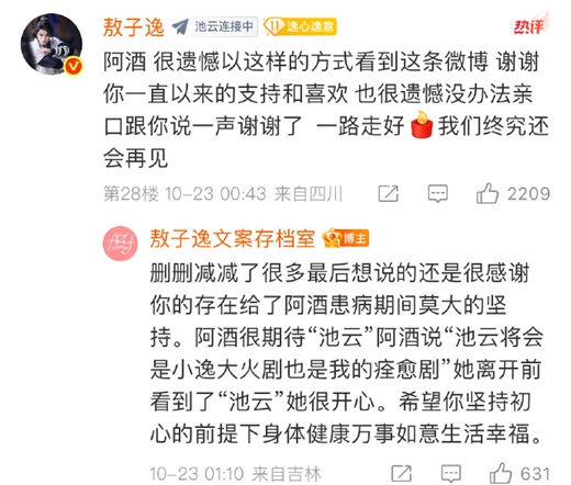 得知阿酒去世的消息后,敖子逸于10月23日凌晨立刻上线,在粉丝账号下留言:“很遗憾以这样的方式看到这条微博……一路走好,我们终究还会再见”。他特别提及阿酒对《池云》的期待,那句“阿酒,很遗憾以这样的方式看到这条微博,谢谢你一直以来的支持和喜欢,也很遗憾没办法亲口跟你说一声谢谢了。一路走好[蜡烛]我们终究还会再见”,仿佛是一声穿越生死的呼唤,让人感受到了他对粉丝深深的感激和不舍。