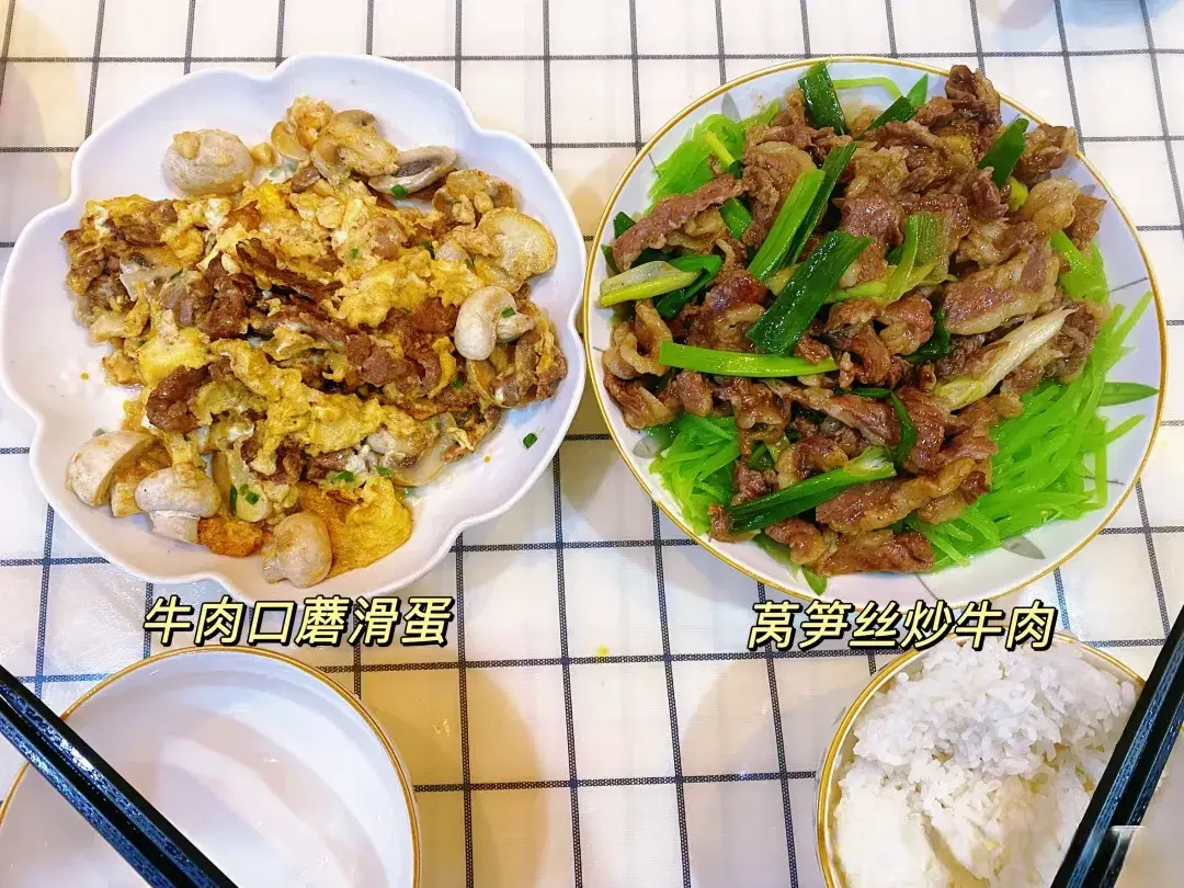 看看这牛肉口蘑滑蛋,还有莴笋丝炒牛肉,。太太太下饭了吧!