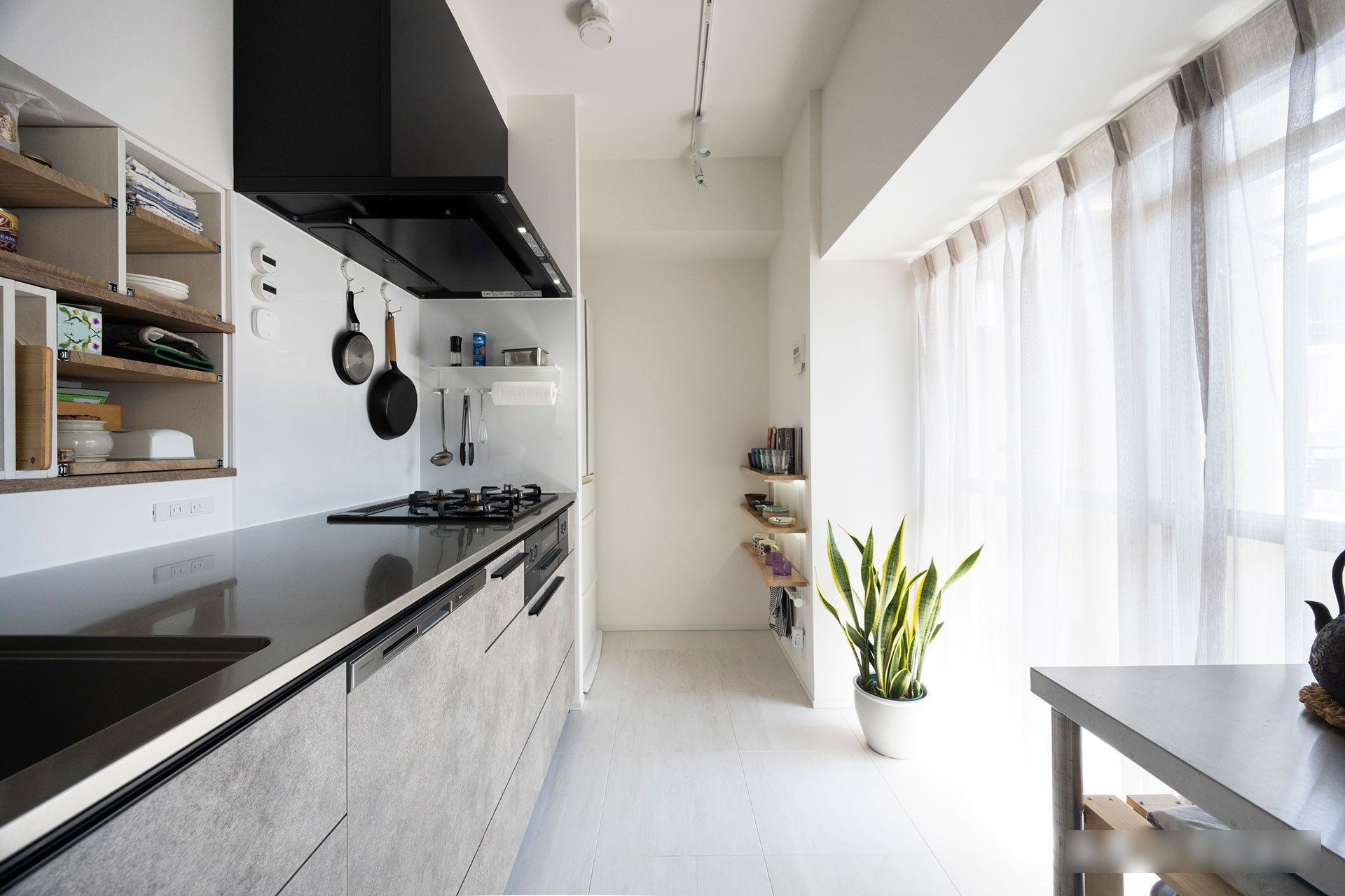 为了极致利用空间,他们把厨房设置在阳台,并定制超大的岛台与之相连。