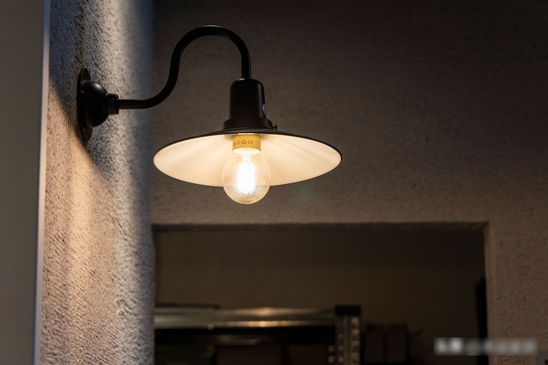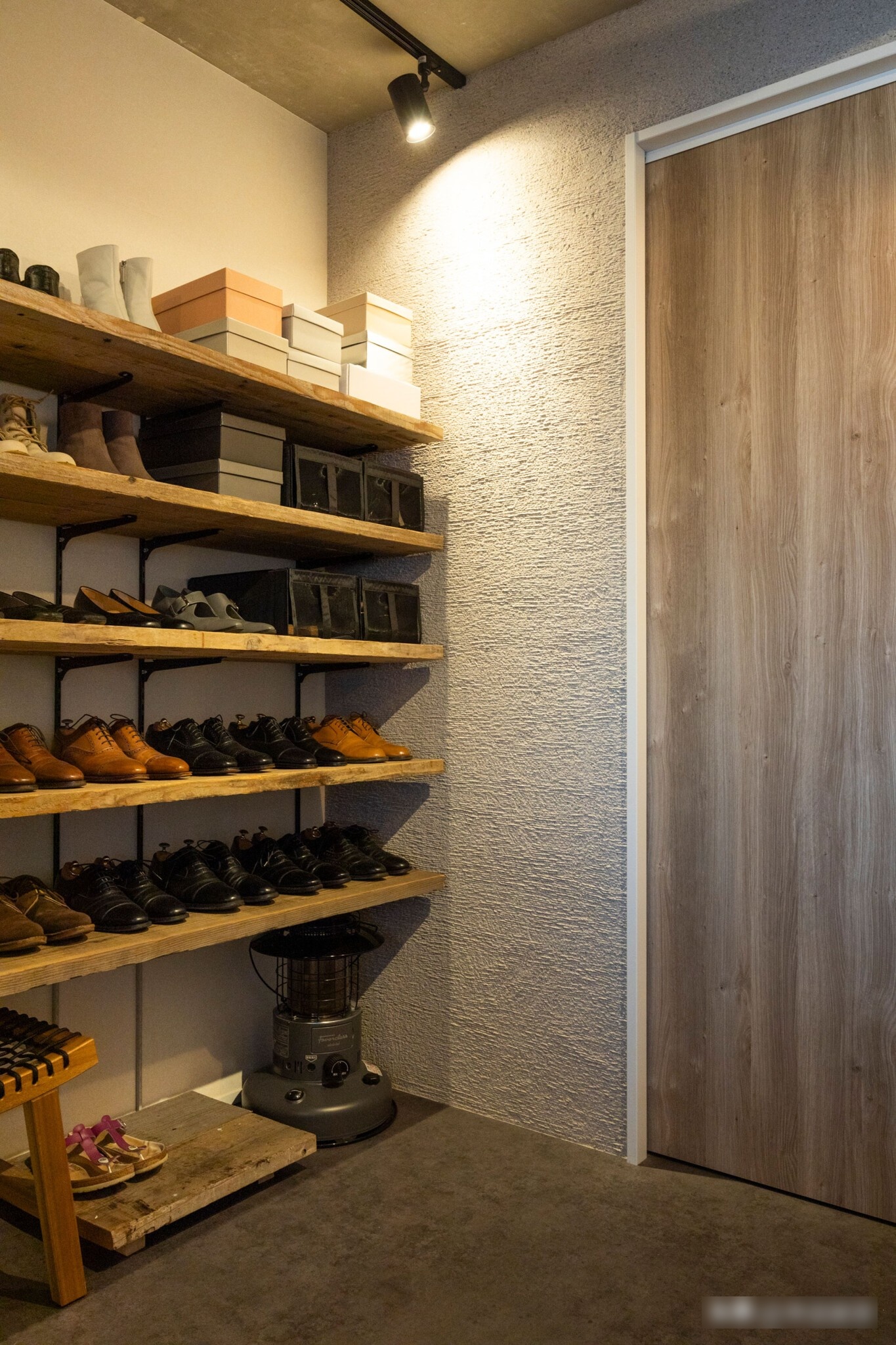 玄关澄净素朴,地面做水泥自流平,左边靠墙安装了5层木质层板架,下面两层放置男主人的常穿鞋,上面三层则是女主人的地盘。