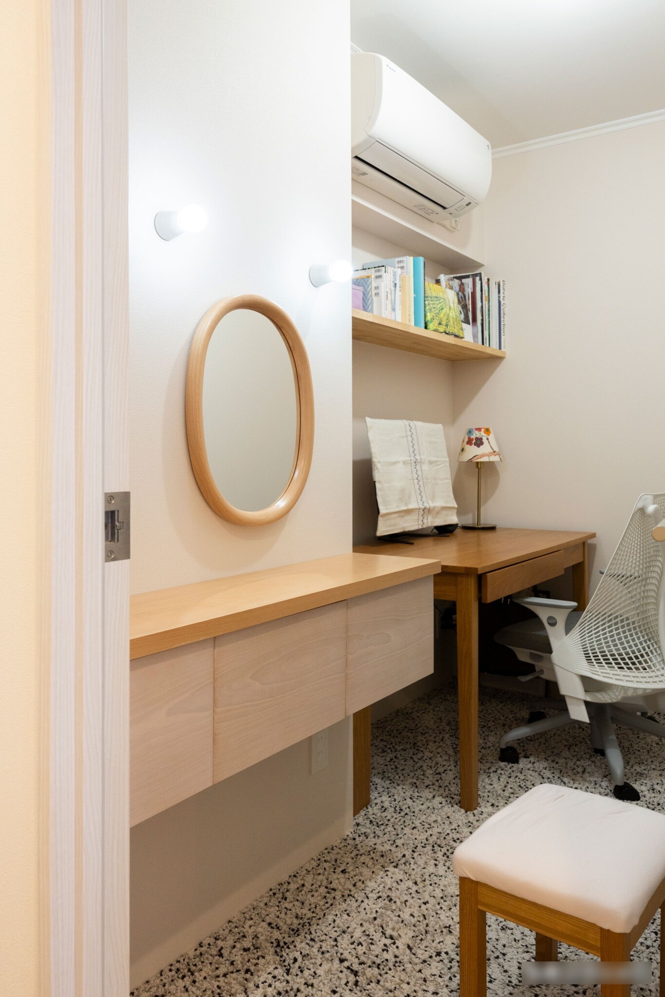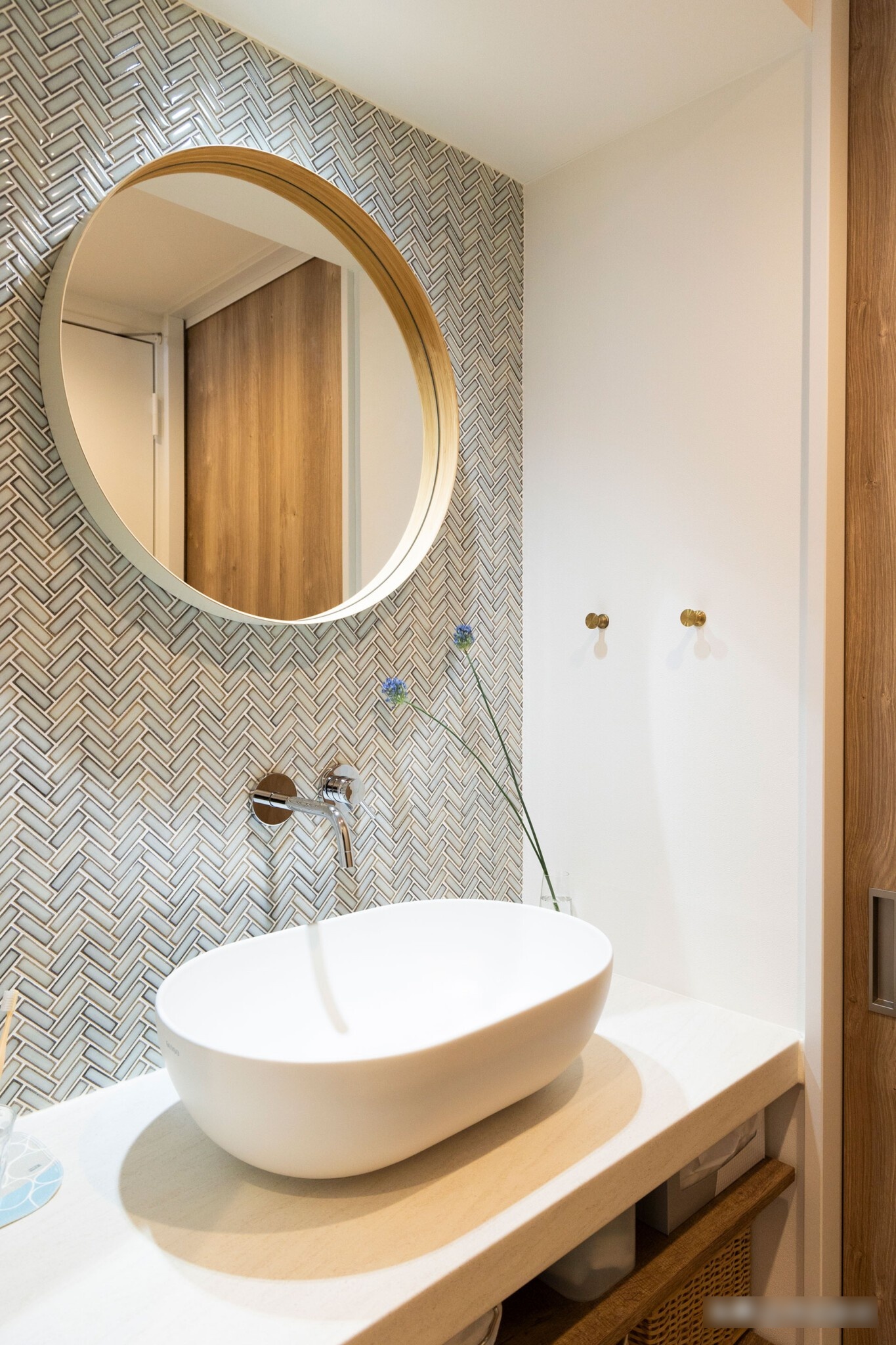 他们家把洗手台外置,下方的木制层板借助藤编蓝,收纳可以做到井然有序,而墙面贴小块瓷砖,搭配白色台上盆和墙面出水,显得高级精致。