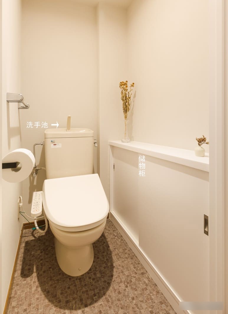 马桶间就是一个小世界,马桶水箱上面自带迷你洗手池,废水会流回到水箱,实现循环利用,兼具环保与便利。侧面的薄储物柜可以储藏清洁用品,拿取方便。