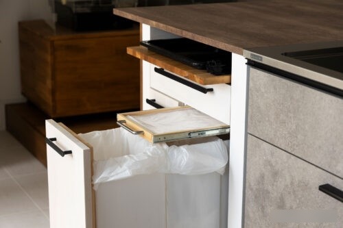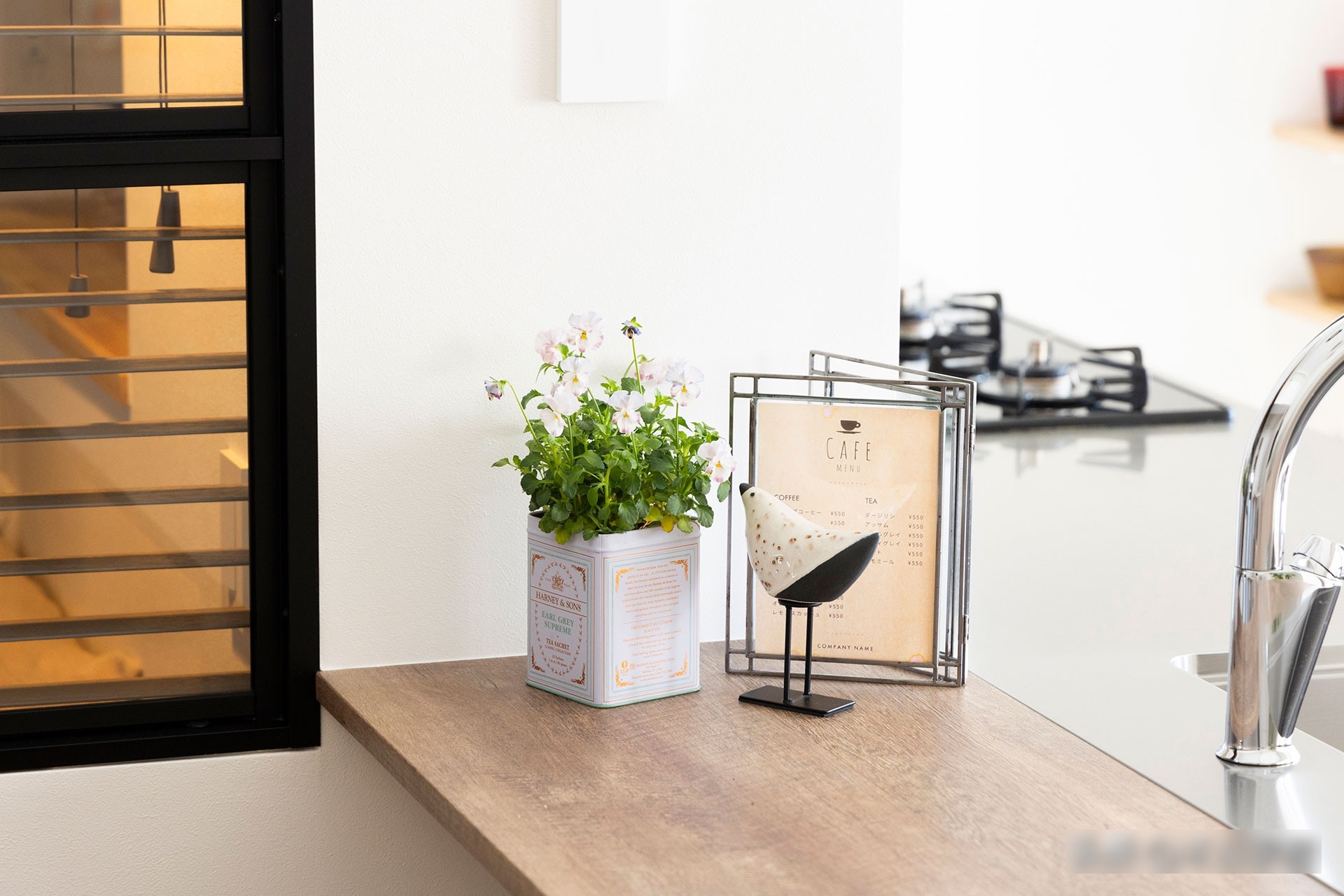 厨房区域简单利落,台面上没有放置任何杂物,搭配虎皮兰小绿植,更显得清新十足。