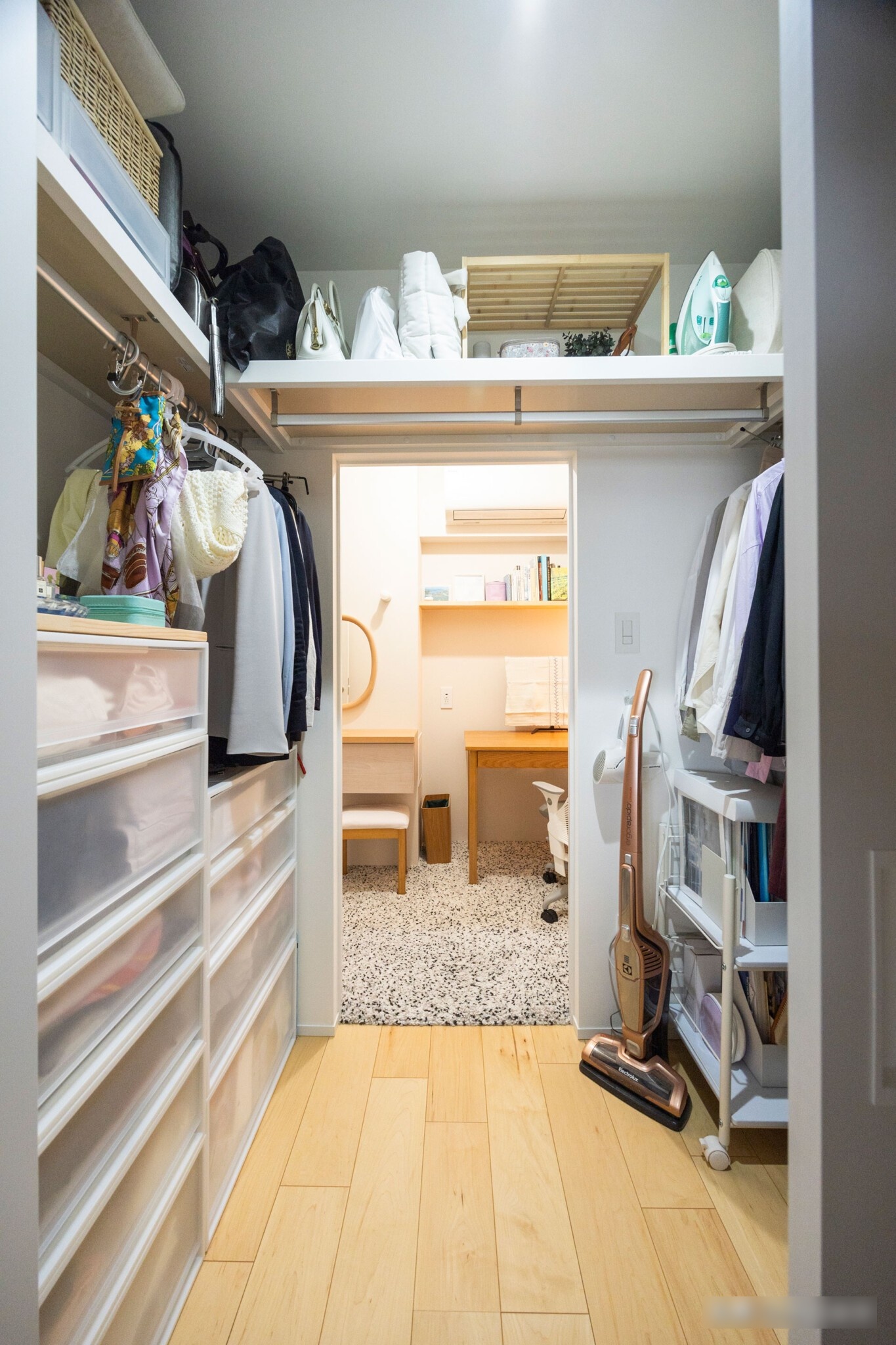 收纳做到可圈可点,左侧为悬挂区,右侧层板叠放常服,搭配透明收纳盒,分类收纳各种衣物和配饰,天花配置3000K柔和的灯光,营造出宁静温暖的氛围。