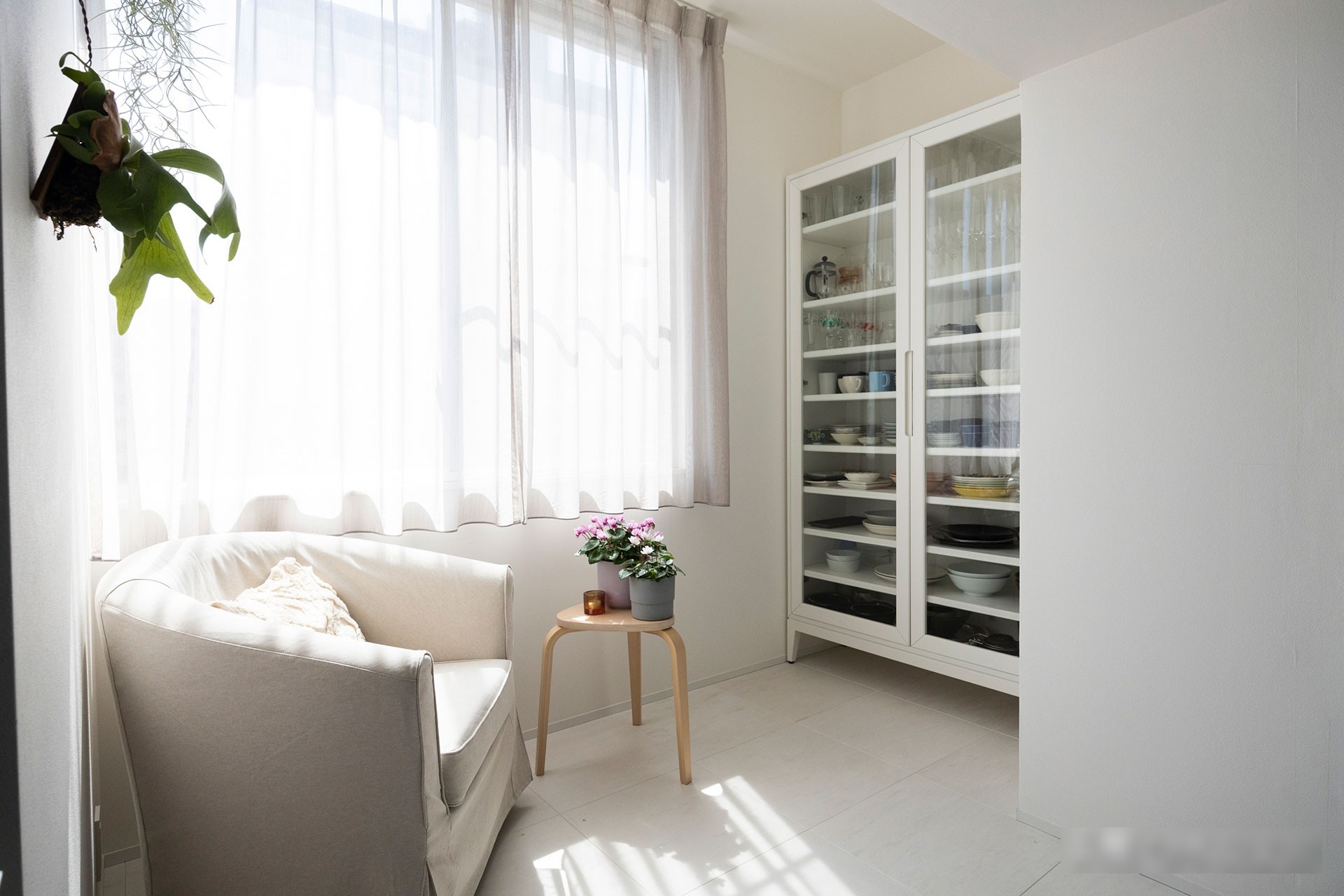 当自然光穿过白色窗帘,时光都变得轻柔,此时蜷在沙发里,手捧一杯刚煮好的咖啡,翻书间隙抬头望去,还能欣赏收藏的碗碟和杯子,想想都很惬意。