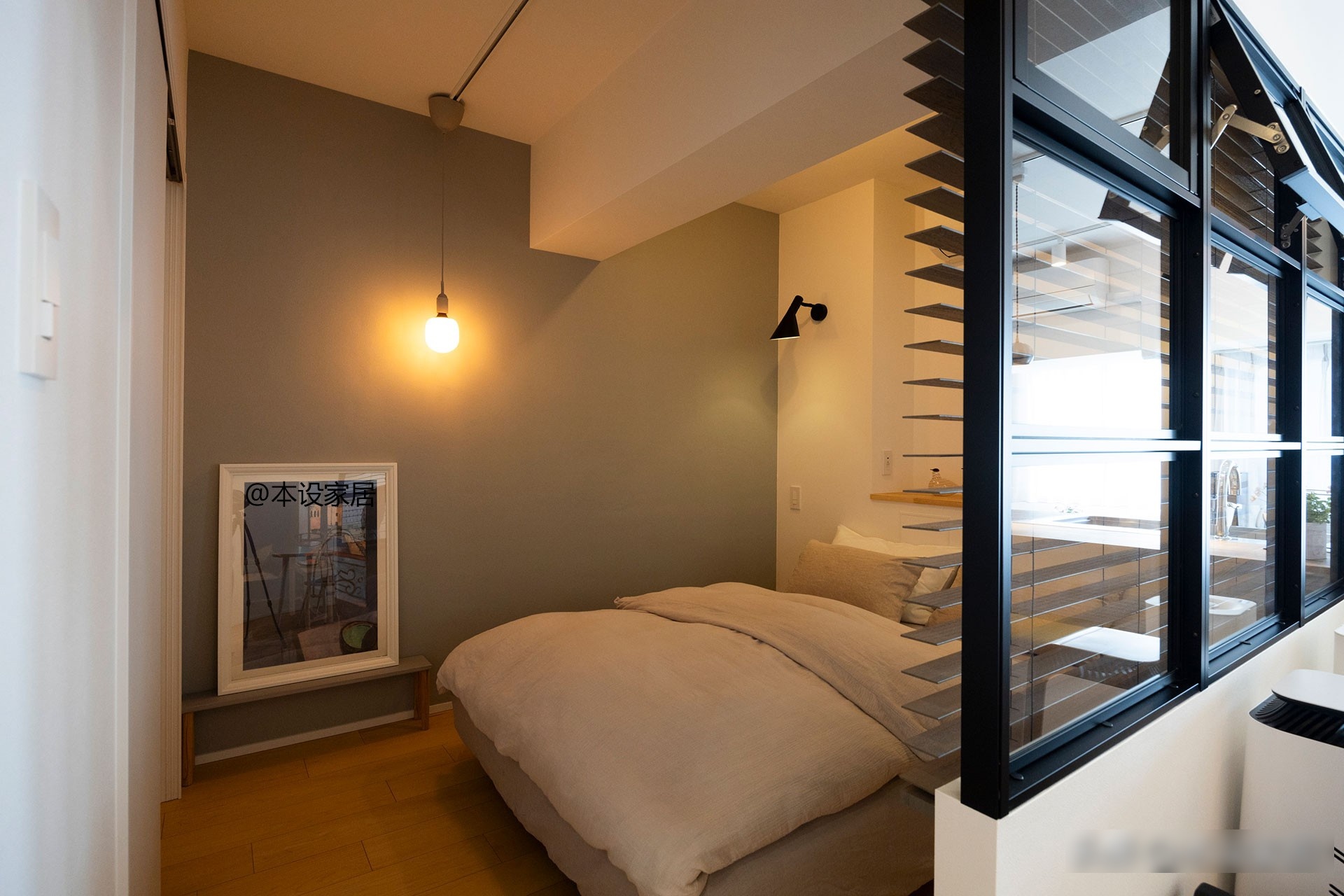 卧室面积约8㎡,居中布置,与餐厅之间采用玻璃半墙做隔断,透光的同时,也减少室外噪音的干扰。