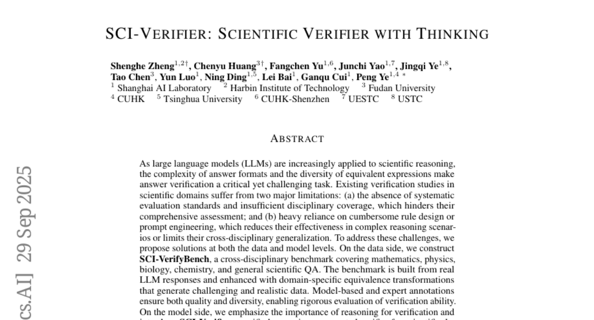 这项由上海AI实验室的郑盛鹤、黄晨宇等多位研究人员领导的前沿研究,汇集了哈尔滨工业大学、复旦大学、中国香港中文大学、清华大学等多所知名院校的专业力量。该研究成果发表于2025年1月的预印本论文平台,论文编号为arXiv:2509.24285v1,为科学验证领域带来了突破性进展。