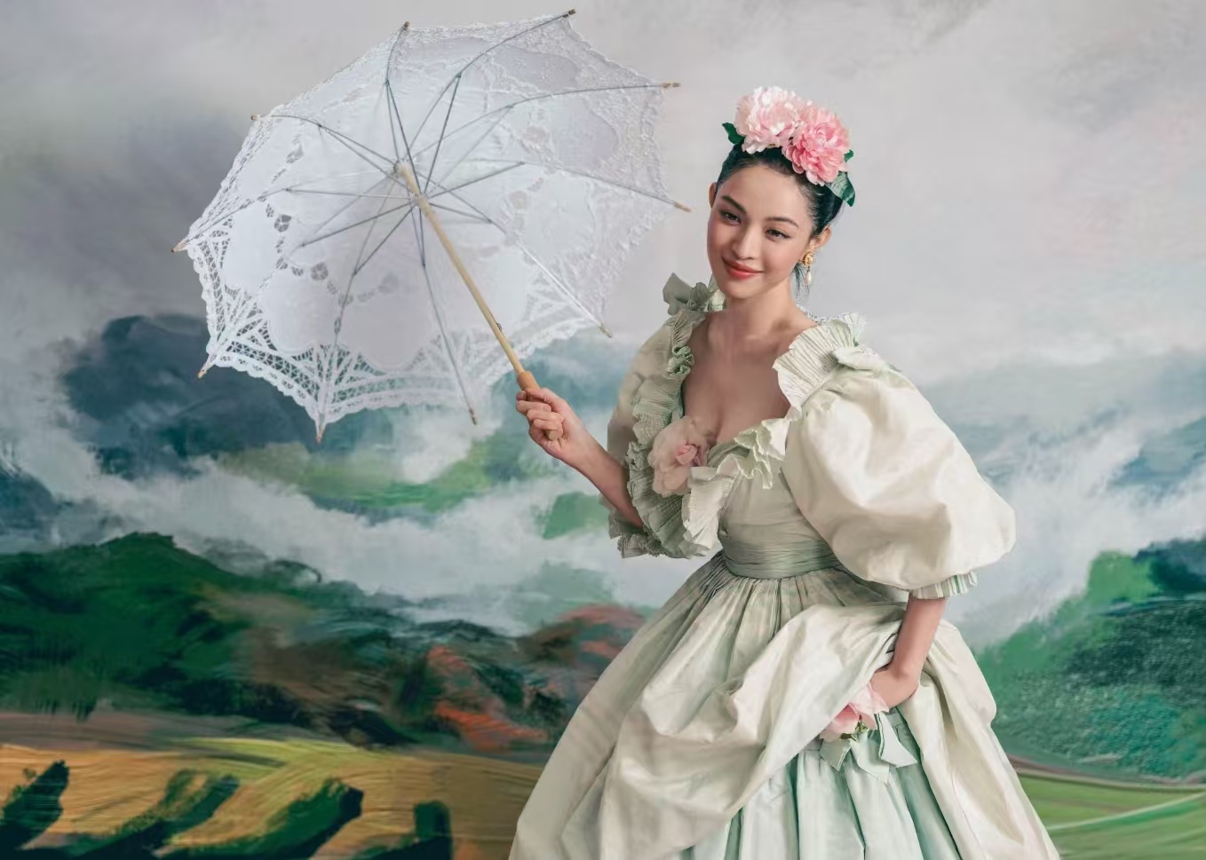 再看她的仪态,肩膀打开的角度、脖子伸的弧度、提裙摆的高度,都像照着教科书来的,网友说她是 “行走的古典油画”,真不算夸张。这哪儿是简单穿件衣服啊,更像是在致敬 1987 年的时尚审美 —— 当年 Nina Ricci 最拿手的浪漫设计,借着她又 “活” 了一次。