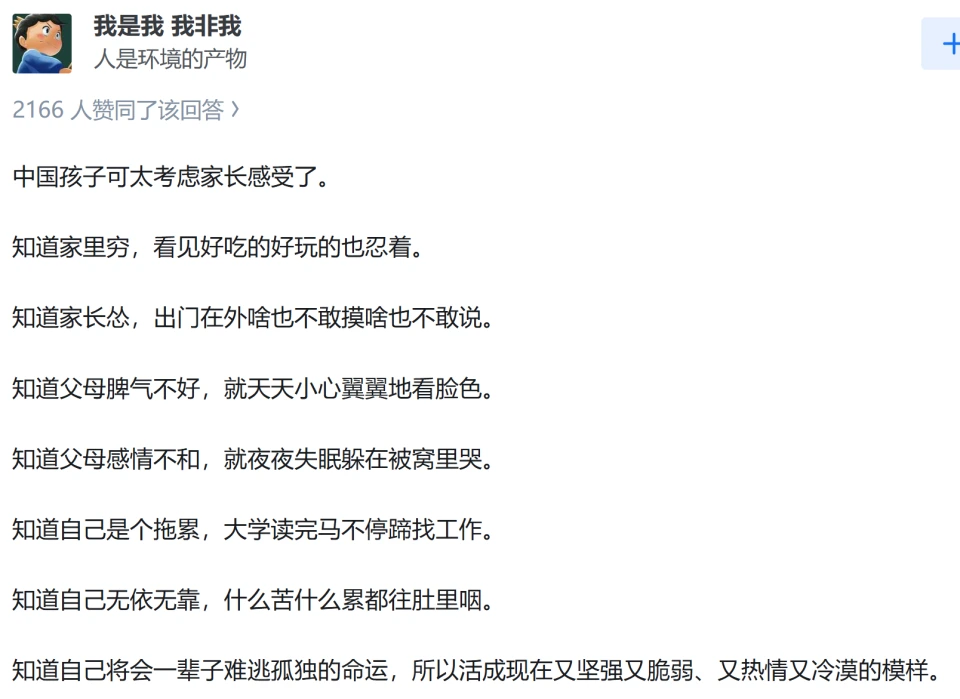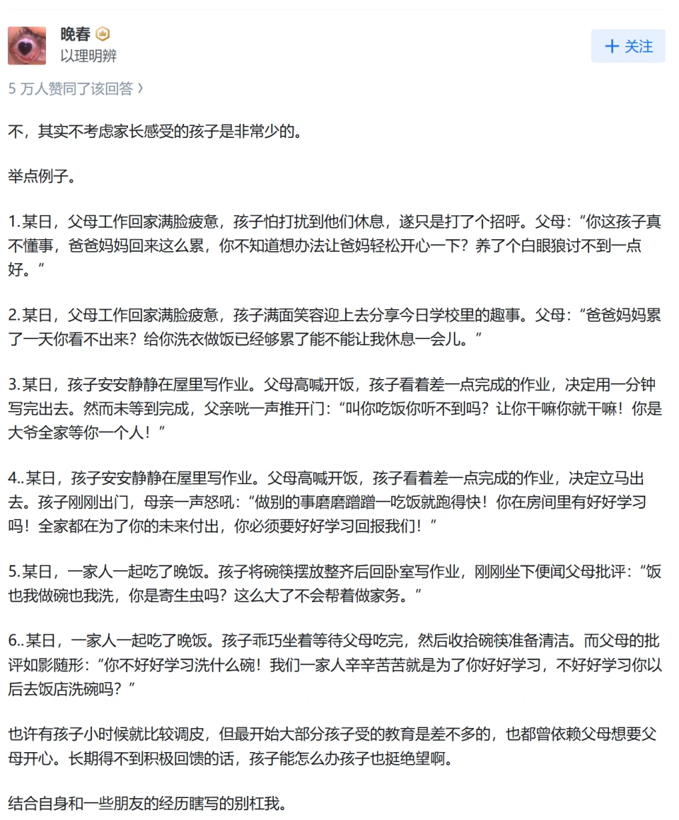 过了很久,情绪有些冷静了,打开手机,想在网上找点同是天涯可怜妈的安慰,结果就刷到有人在“为什么很多孩子不会考虑父母的感受”下,写的一个回答: