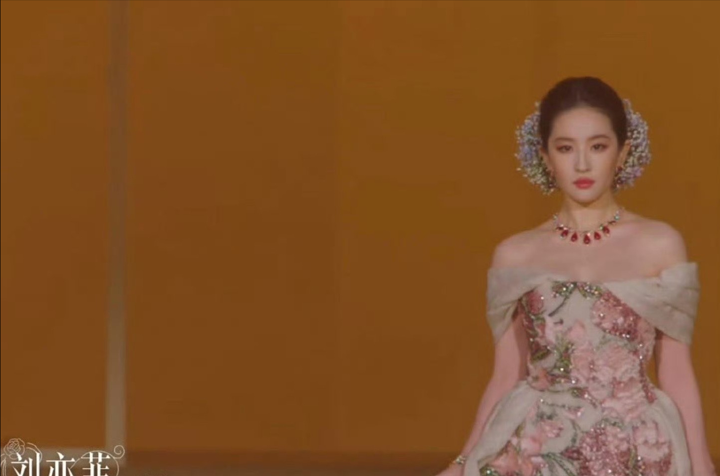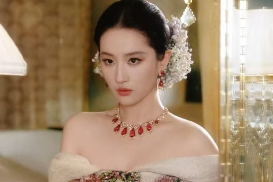 而且宝格丽红宝石项链在颈间折射出流光,与鎏金簪花头饰相映,复古盘发上的满天星随动作轻晃,恍惚间竟让人想起二十年前《金粉世家》里的白秀珠,只是如今的刘亦菲,更多了几分历经时光沉淀的贵气。