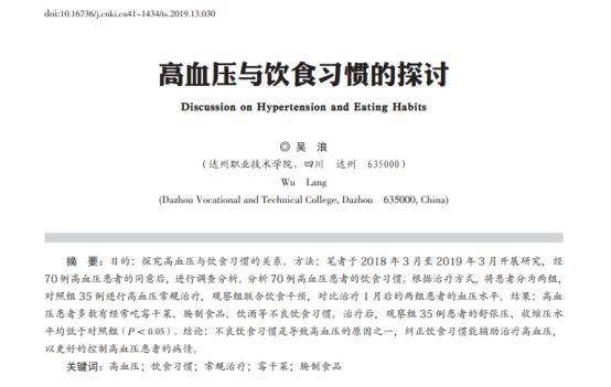 [1]吴浪.高血压与饮食习惯的探讨[J].现代食品,2019