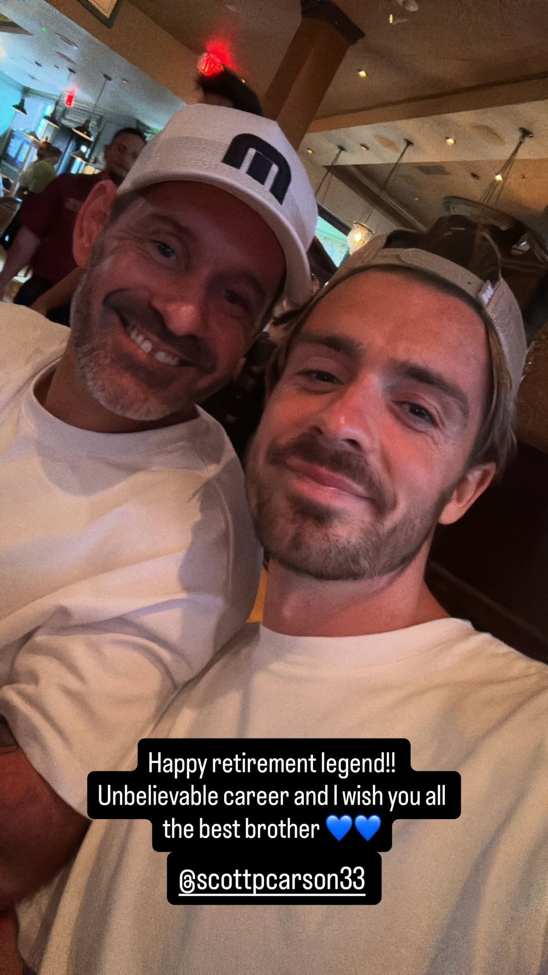 卡森宣布退役后不久,他在曼城的前队友格拉利什在个人社媒晒出一张合照,配文:“退役快乐,传奇!你的职业生涯不可思议,祝你未来的生活一切顺利,兄弟!”