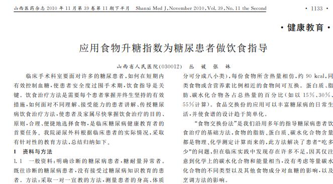 [1]丛媛.应用食物升糖指数为糖尿患者做饮食指导, 山西医药杂志(下半月刊) ,2010-11-25