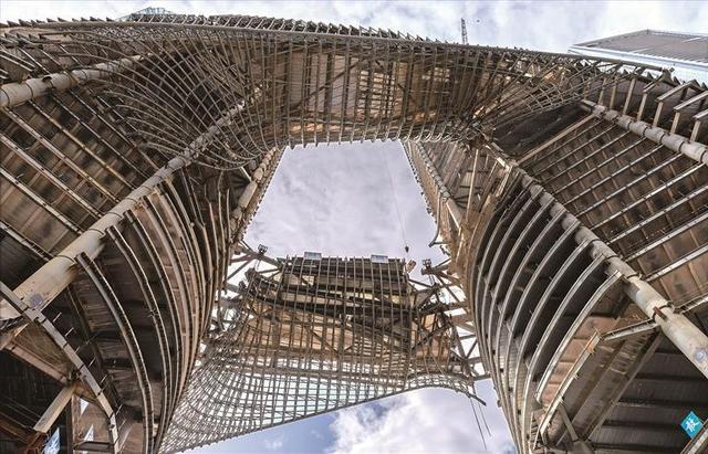 随着6000吨钢结构连廊在近120米高空完成提升合龙,深圳湾超级总部基地东、西双塔正式连为一体。