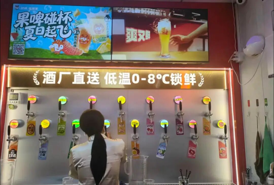 一个门店一般有2个员工,负责下单、打酒和打包。柜台后面就是啤酒售卖墙,上面有十多个啤酒龙头,“店员几乎无需培训就可以随时上岗”,饮品报指出。
